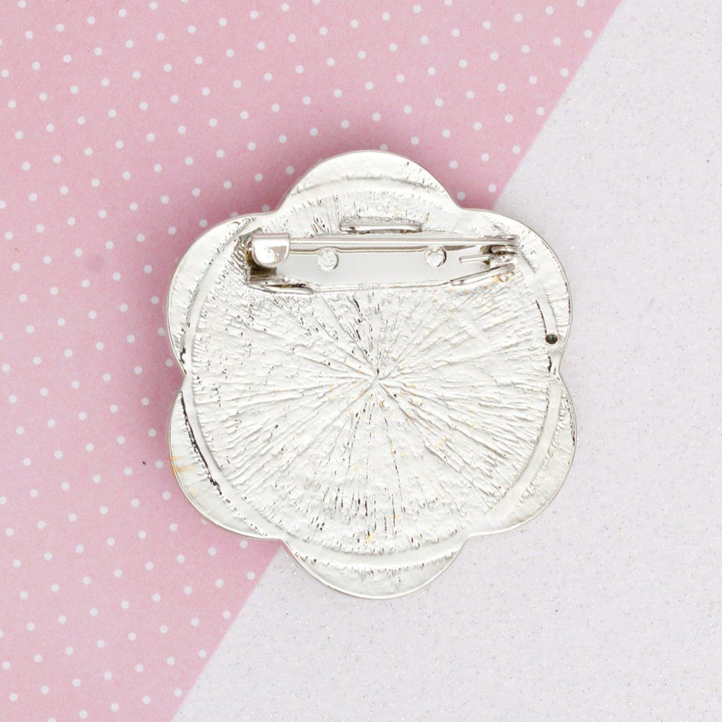 Women's Brooch Pin. Timeless Classic Silver Metal with Black Epoxy Camellia Flower Shaped Brooch Pin Featuring Acrylic White Pearl Center and Clear Rhinestone Edge Detail. Safety Pin Hook Closure.