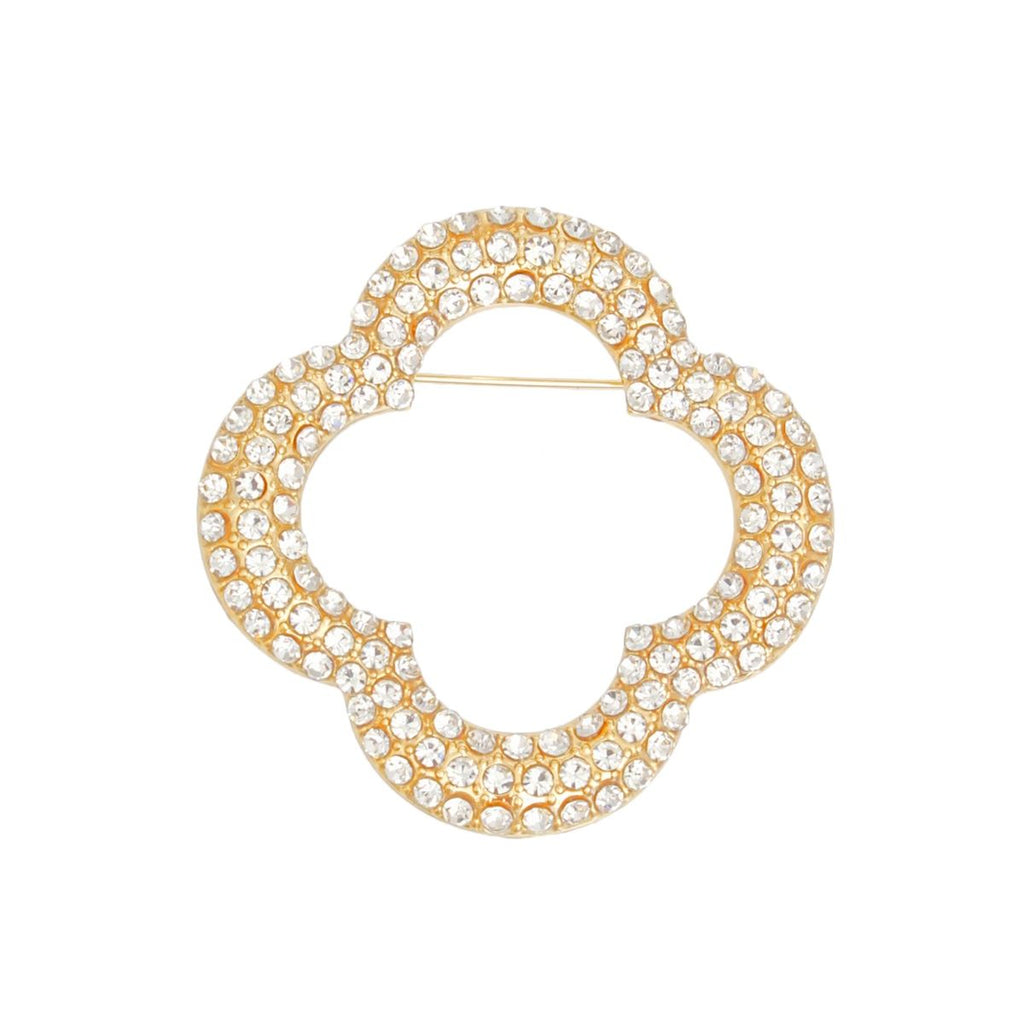 Women's Brooch Pin. Gold Metal Cutout Quatrefoil Shaped Brooch Featuring Clear Rhinestone Detailing. Pin Safety Catch Closure.