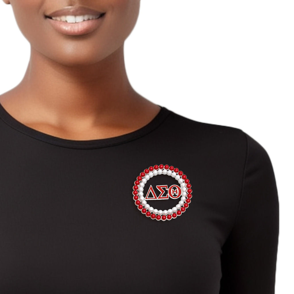 Delta Sigma Theta Sorority Paraphernalia Women's Brooch Pin. Silver Metal Round Brooch Pin Featuring Red and White Pearl Stud Edge and DST Greek Letter Detail. Safety Pin C Clasp Closure.