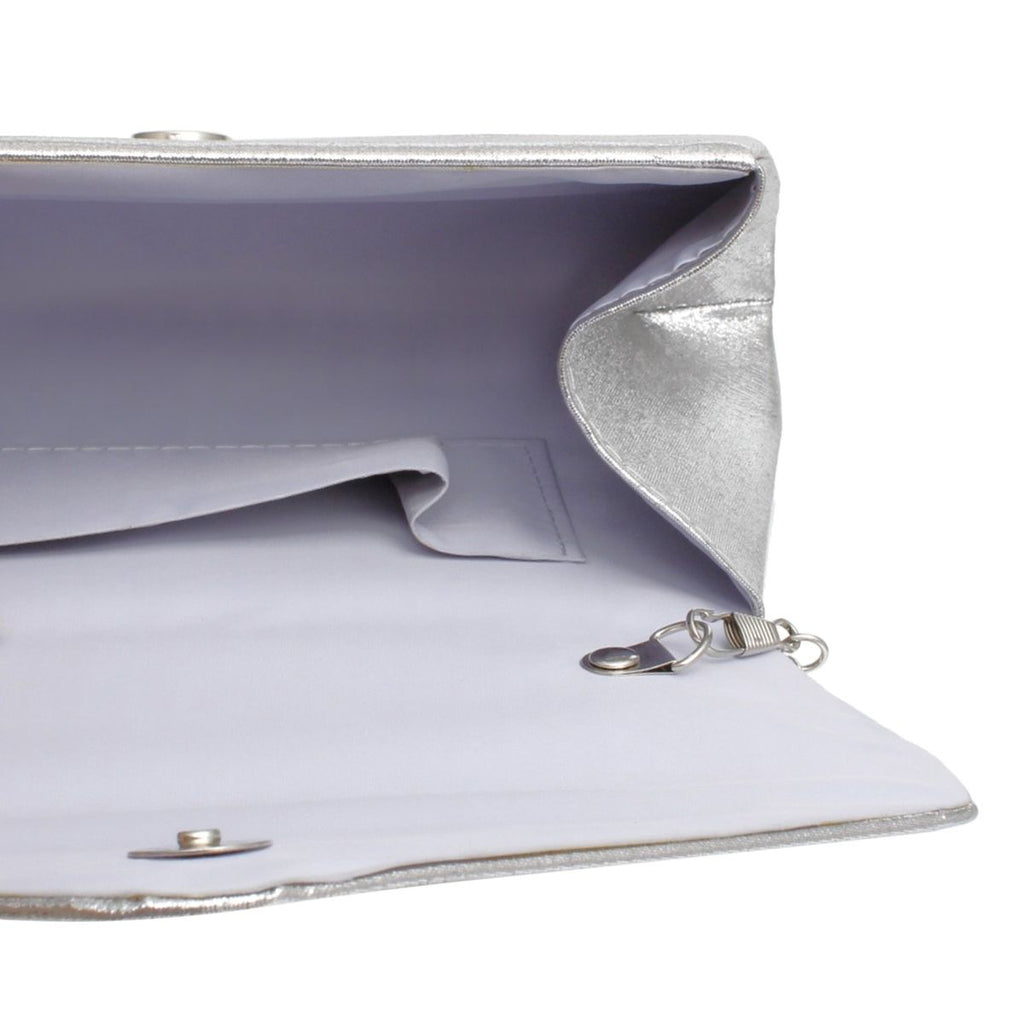Women's Evening Clutch Handbag. Elegant Metallic Silver Fabric Evening Clutch Featuring Vibrant Multicolor Embroidered Phoenix Bird Detailing. Envelope Style with Flap and Snap Closure. Detachable Silver Metal Shoulder Chain Included.