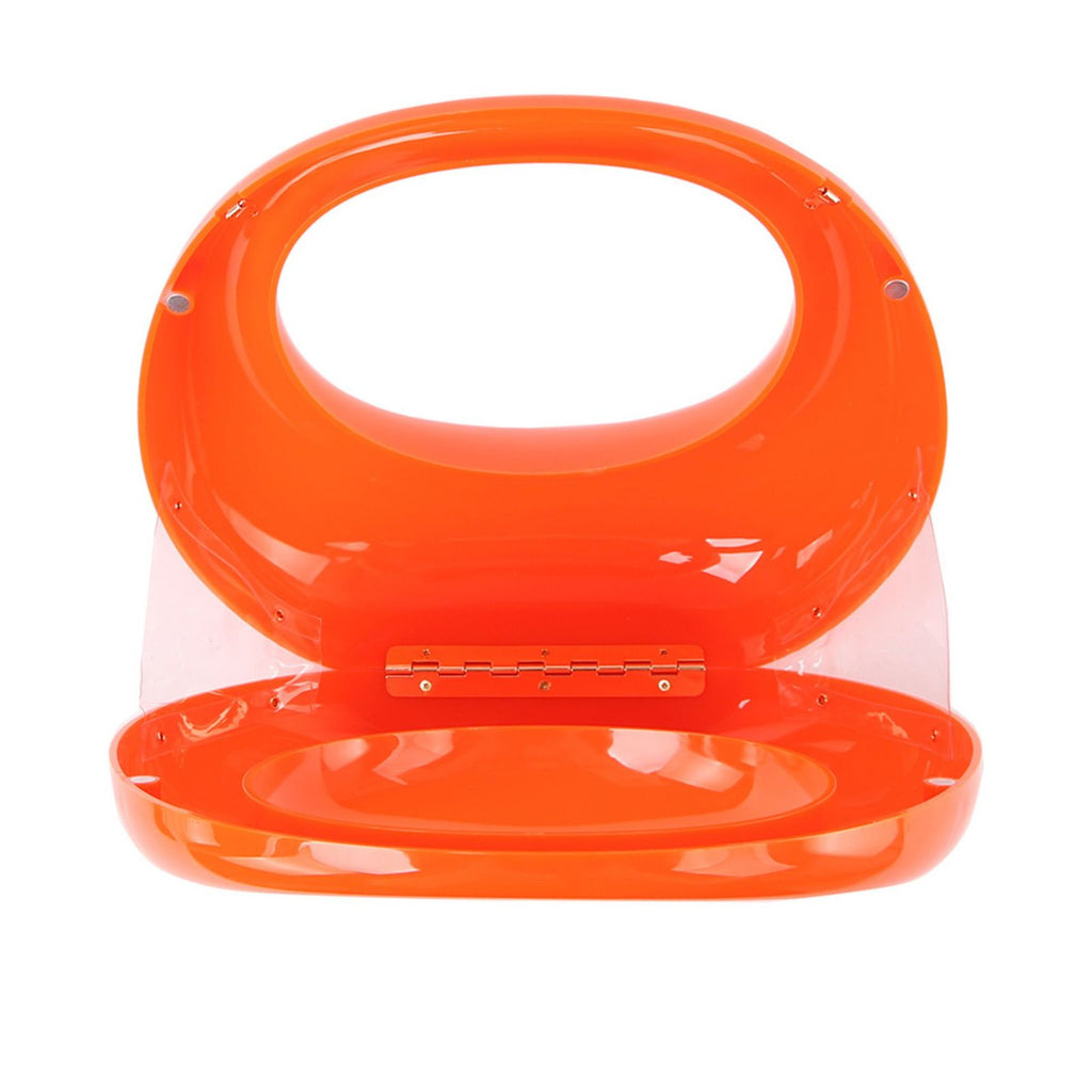 Women's Top Handle Evening Handbag. High Quality Smooth Finish Orange Acrylic Crescent Moon Shaped Top Handle Handbag. Hinge Magnetic Closure with Clear Plastic Sides for Convenient Opening and Closure. Includes Detachable Gold Metal Shoulder Chain.