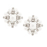 Silver Metal Round Stud Earrings Featuring White Pearls and Baguette Crystal Detailing