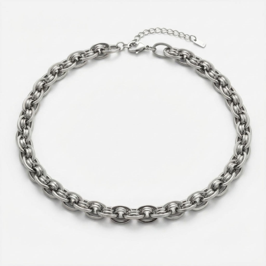 Women's Stainless Steel Chain Necklace. Premium 8mm Stainless Steel Handmade Oval Link Chain Necklace for Women Featuring Classic Silver Steel Color. Waterproof and Corrosion-Resistant, Making it Ideal for Items that are Worn Daily. Stainless Steel Plate Tag and Heavy Duty Lobster Clasp Closure. Hypoallergenic and Safe for Sensitive Skin.