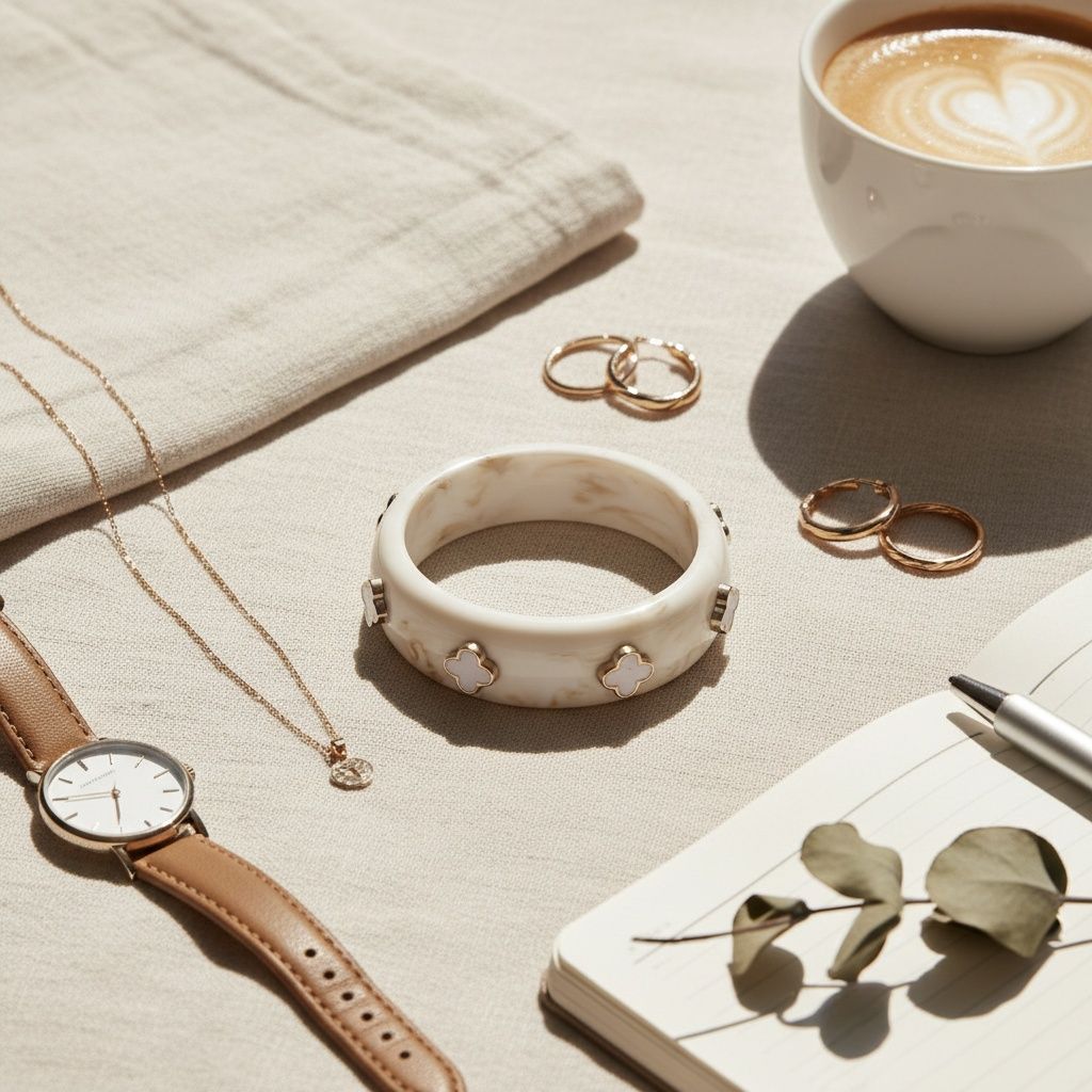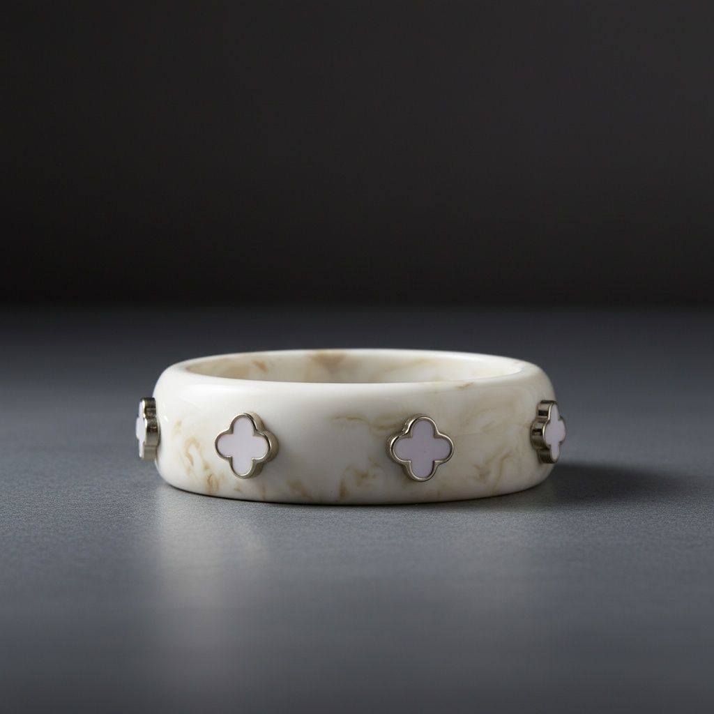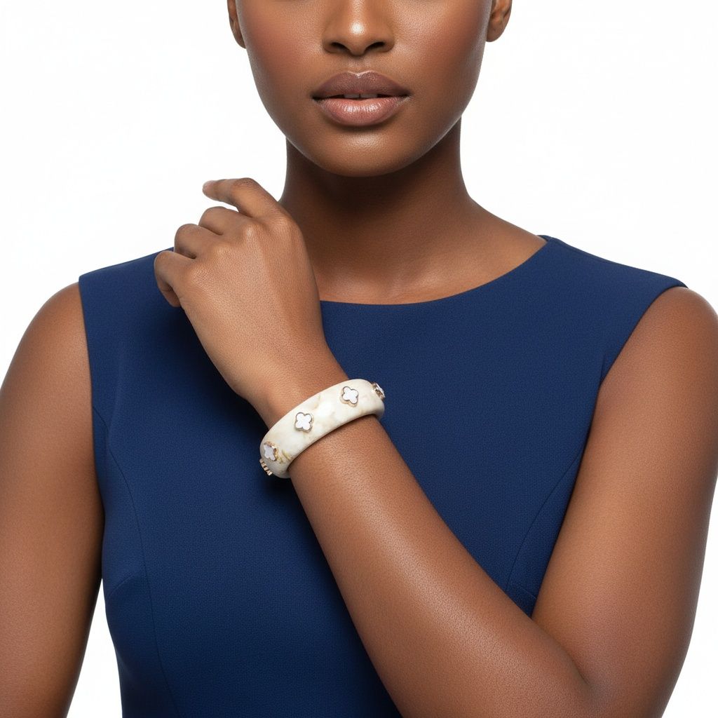 Women's Bangle Bracelet. Marbled Ivory Resin Bangle Infused with Subtle Brown Fleck Detailing for Added Depth and Dimension. Features White and Gold Quatrefoil Clover Accents for a Bold, Luxe Inspired Finish. Smooth, Structured Silhouette Offers Comfortable Wear with Eye-Catching Appeal.