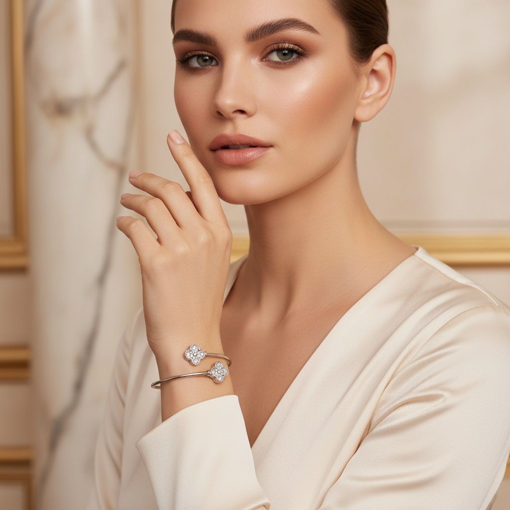 Women's Open Bangle Bracelet. Luxe Silver Metal Wire Adjustable Open Wrap Design Bangle Featuring Clear Pave Rhinestone Clover Quatrefoil End Caps. Clovers measure .65" each.