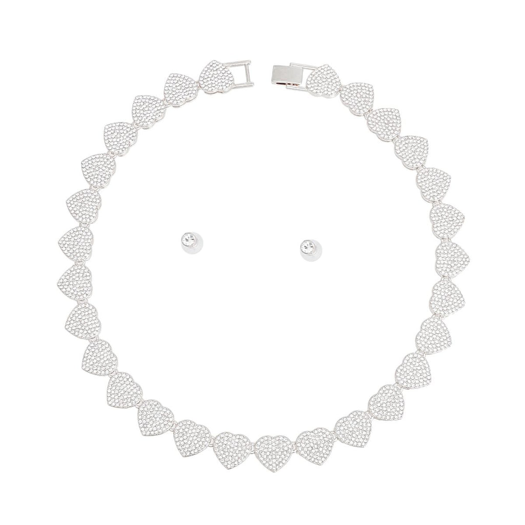 Women's Iced Chain Link Necklace Set. Silver Metal and Clear Pave Rhinestone Fully Embellished Solid Heart Chain Link Necklace Set Featuring Hinged Fold Clasp Closure. Chain measures 14.5mm wide. Includes Matching Rhinestone Post Backing Stud Earrings.