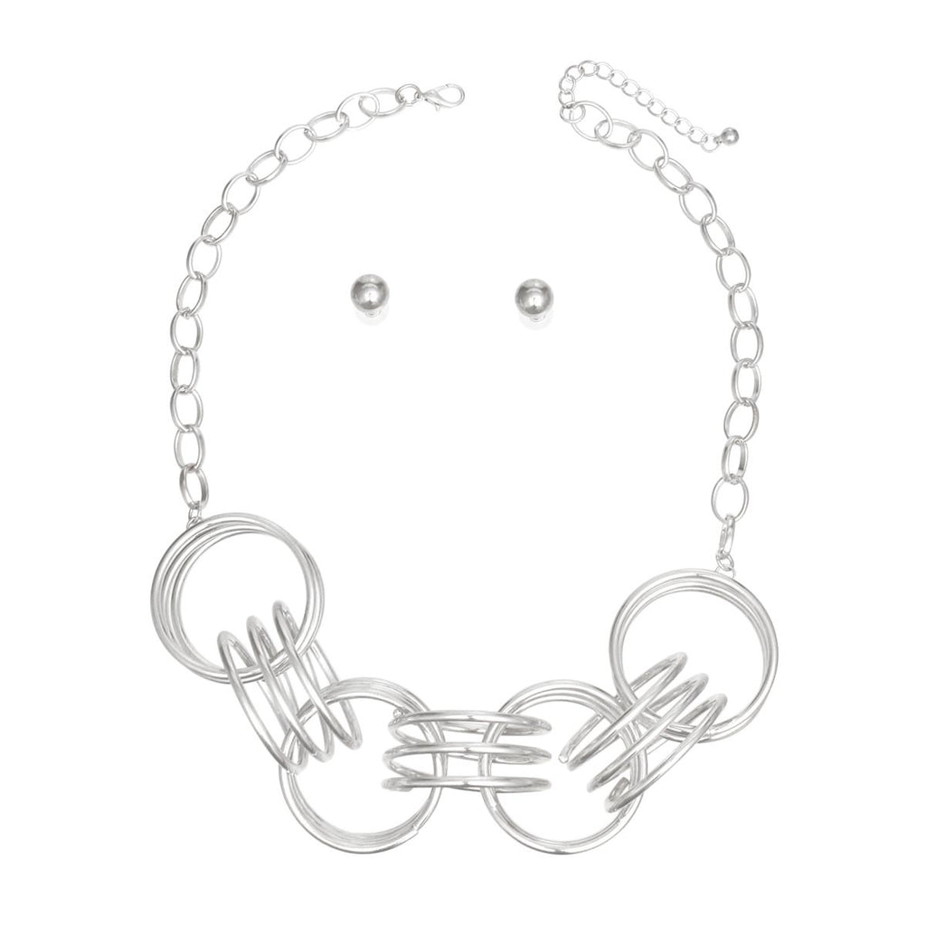 Women's Collar Chain Necklace Set. Edgy Silver Metal Oval Link Necklace Featuring Chunky Collar Comprised of 7 Linked Triple Coiled Metal Wire Rings. Each Ring Measures 1.75" x .75". Lobster Clasp Closure. Includes Matching Ball Stud Post Backing Earrings.