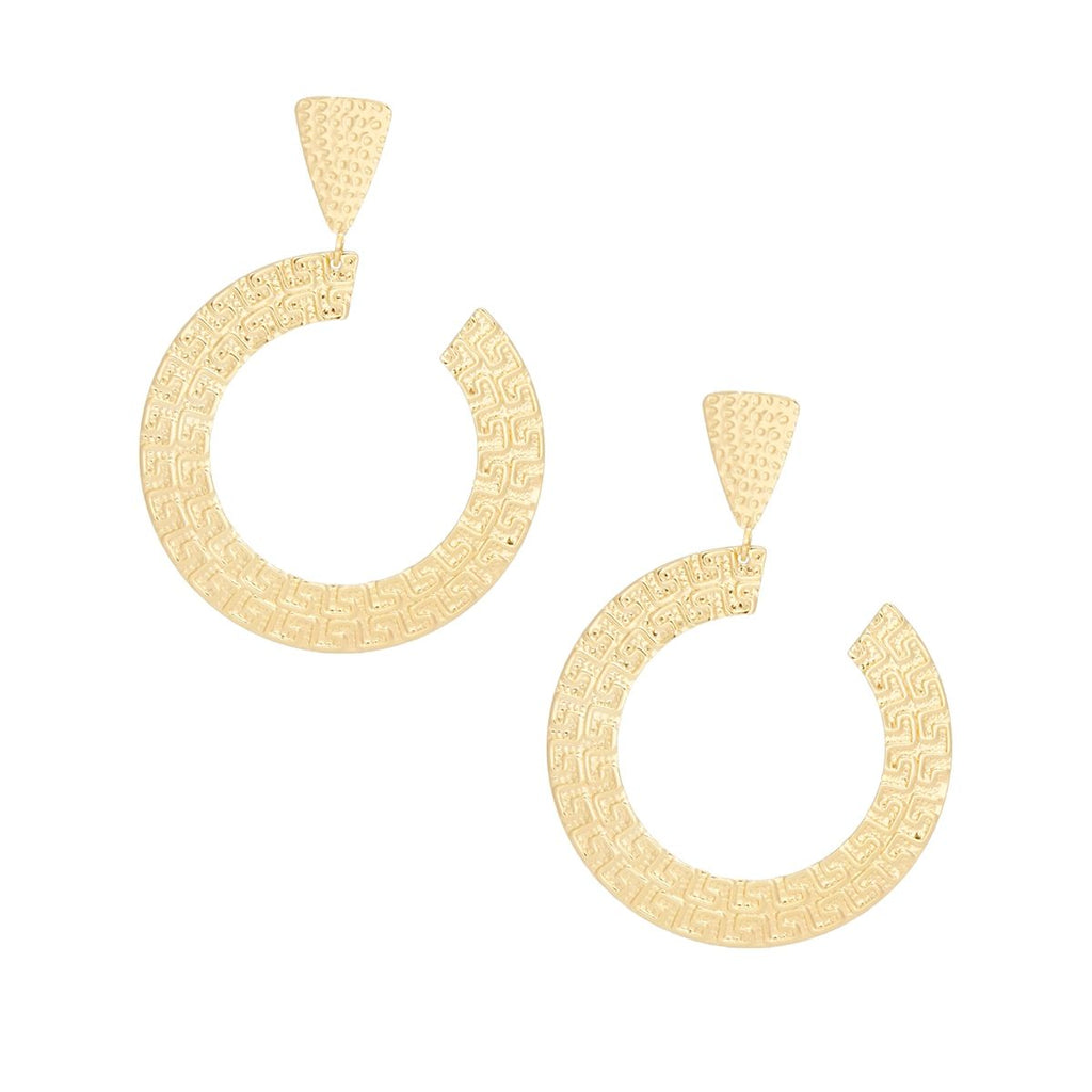 Women's Drop Earrings. Gold Metal Triangle Shaped Studs Featuring C Shaped Drop with Luxe Greek Key Pattern Detailing. Post Backing.