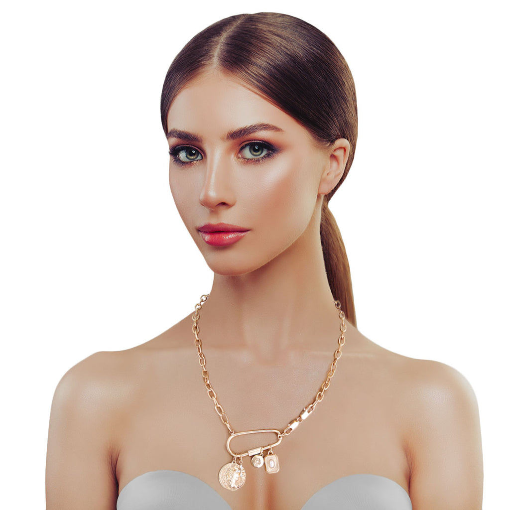 Gold Metal Oval Chain Link Necklace Lanyard Featuring Carabiner with Twist Screw Closure and Coin Charm Details. Carabiner measures 1.75 inches