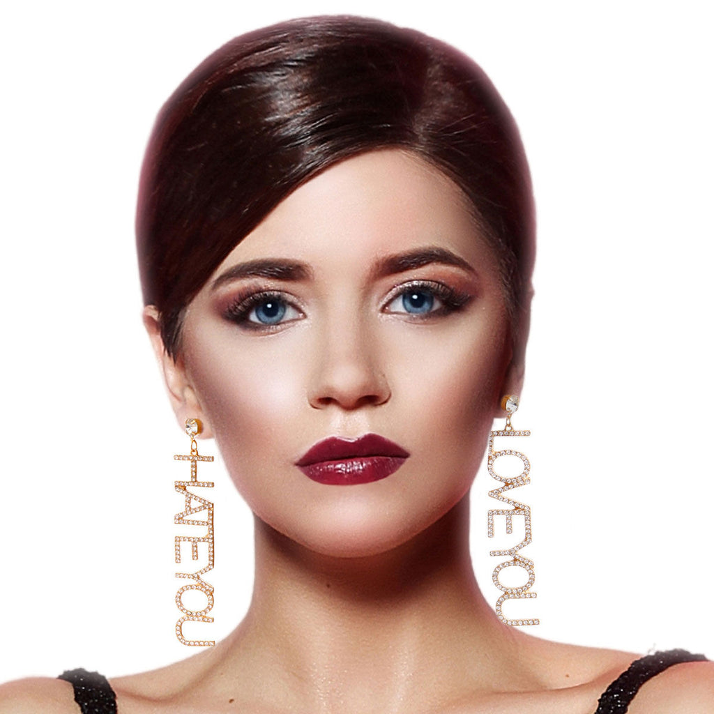 Gold Metal and Clear Rhinestone LOVE YOU and HATE YOU Mixed Earrings. Earrings measure .75 inches wide