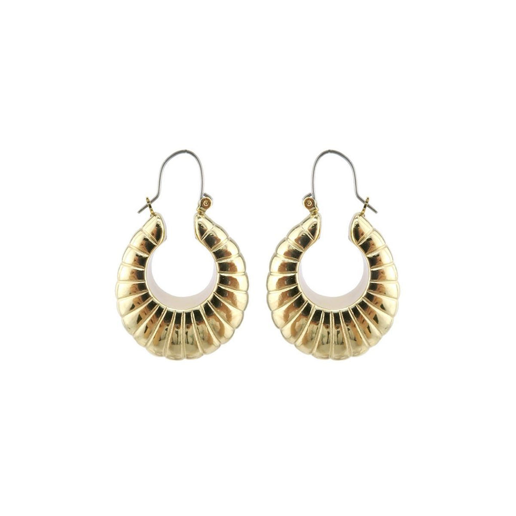 Gold Metal Croissant Shape and Texture Hoop Earrings. Earrings measure 1 inch wide.