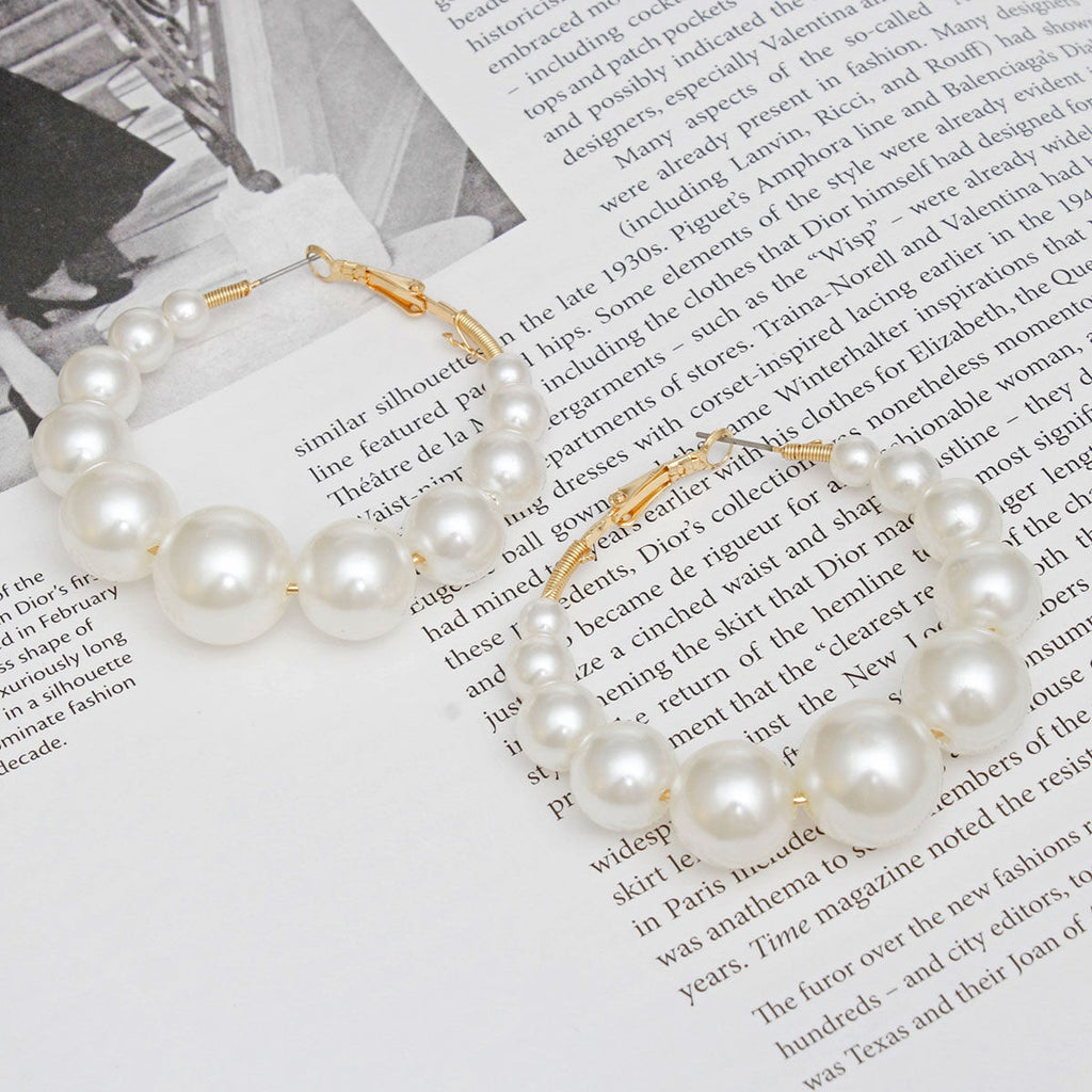 Women's Hoop Earrings. Classic and Chic 55mm Gold Metal Wire and Graduated Acrylic Cream Pearl Hoop Earrings. Large Pearl Measures 15mm .Omega Hoop Closure.