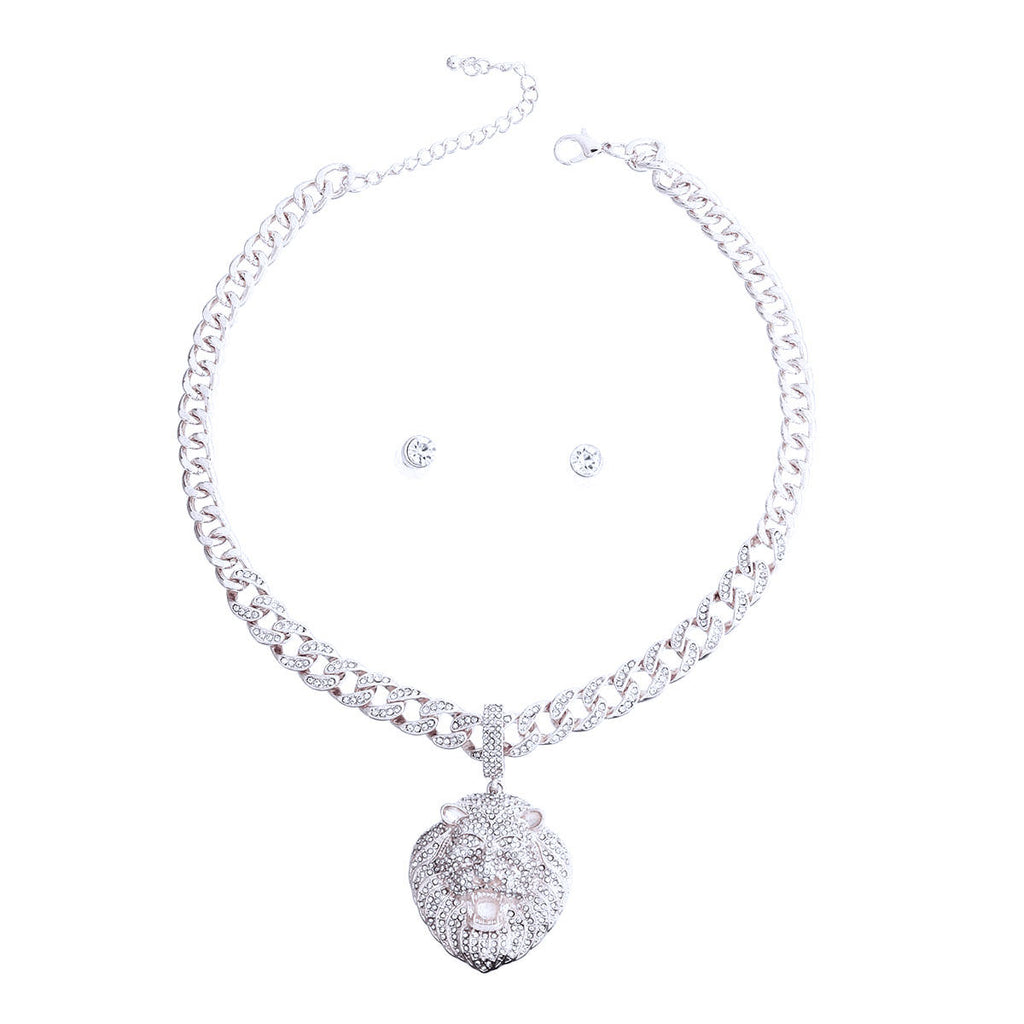 Iced Silver Metal Cuban Chain Necklace Set Featuring Designer Inspired Lion Head Pendant. Pendant measures 2.5 inches long and 1.5 inches wide