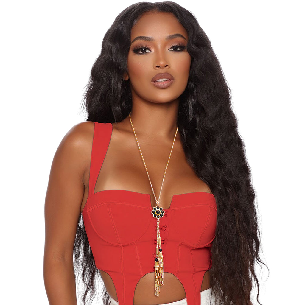 Long Gold Thin Double Tassel Necklace Set with Black Flower