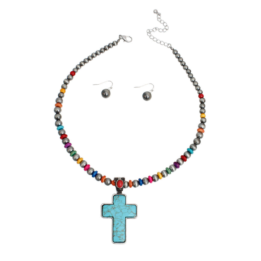 Navajo Pearl and Multi Color Bead Necklace Set Featuring Cracked Turquoise Cross Pendant. Pendant measures 2.5 inches long and 1.5 inches wide.