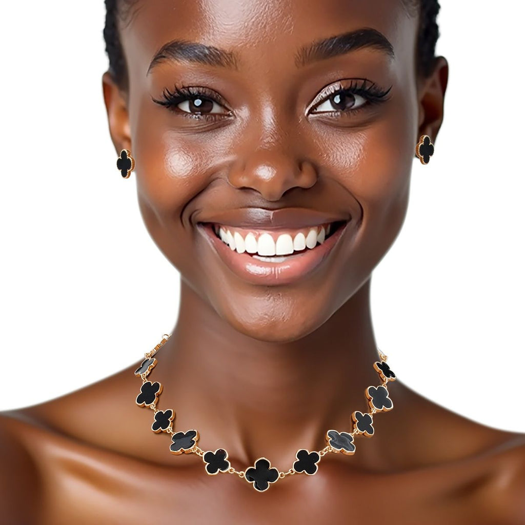 Women's Chain Necklace Set. Luxury Gold Metal with Dual Sided Black Epoxy Large Linked 16 Motifs Quatrefoil Clover Necklace Featuring Alternating Size Quatrefoils. Clovers Measure .75" and .6". Lobster Clasp Closure. Includes Matching Quatrefoil Clover Stud Post Backing Earrings.