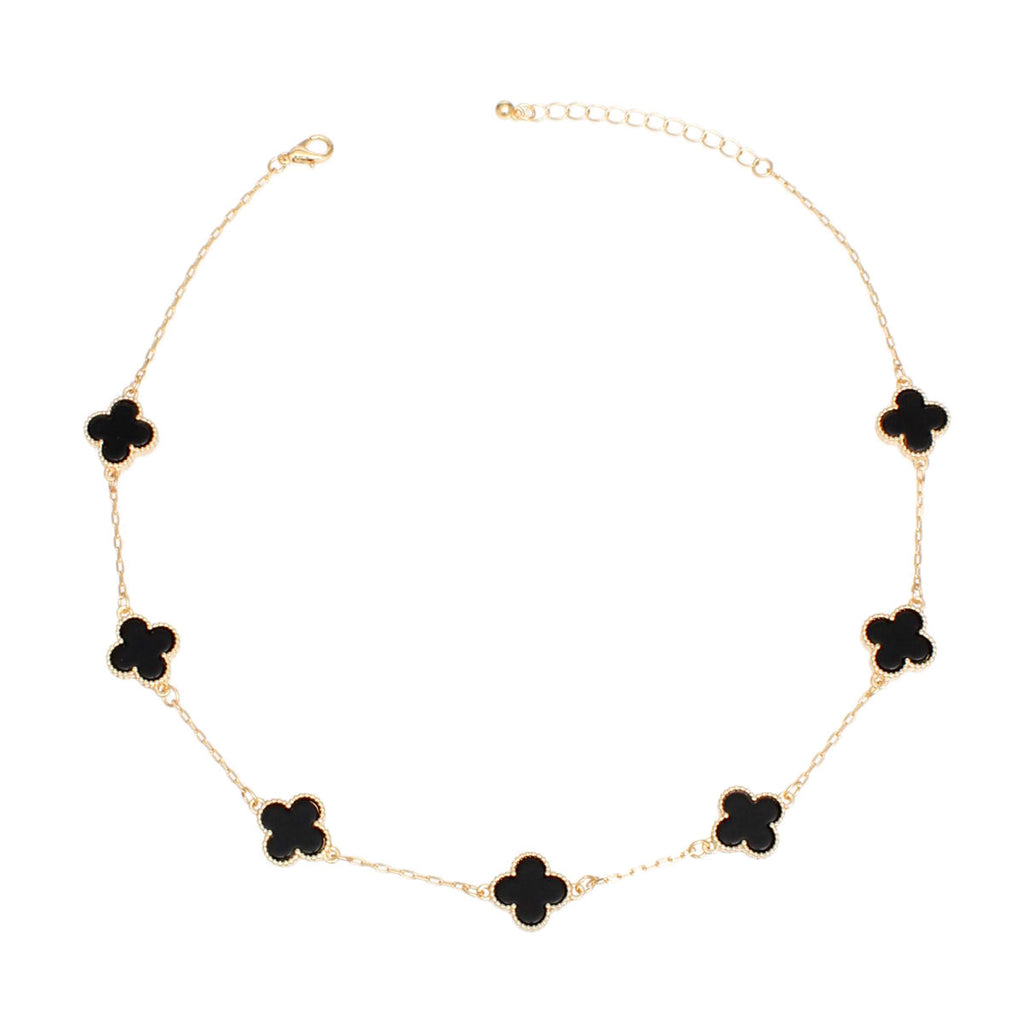 Women's Chain Choker Necklace. Dainty Gold Metal Chain Necklace Featuring Station Black Resin Acrylic Quatrefoil Clover 7 Motifs. Clovers Measure .65" each. Lobster Clasp Closure.