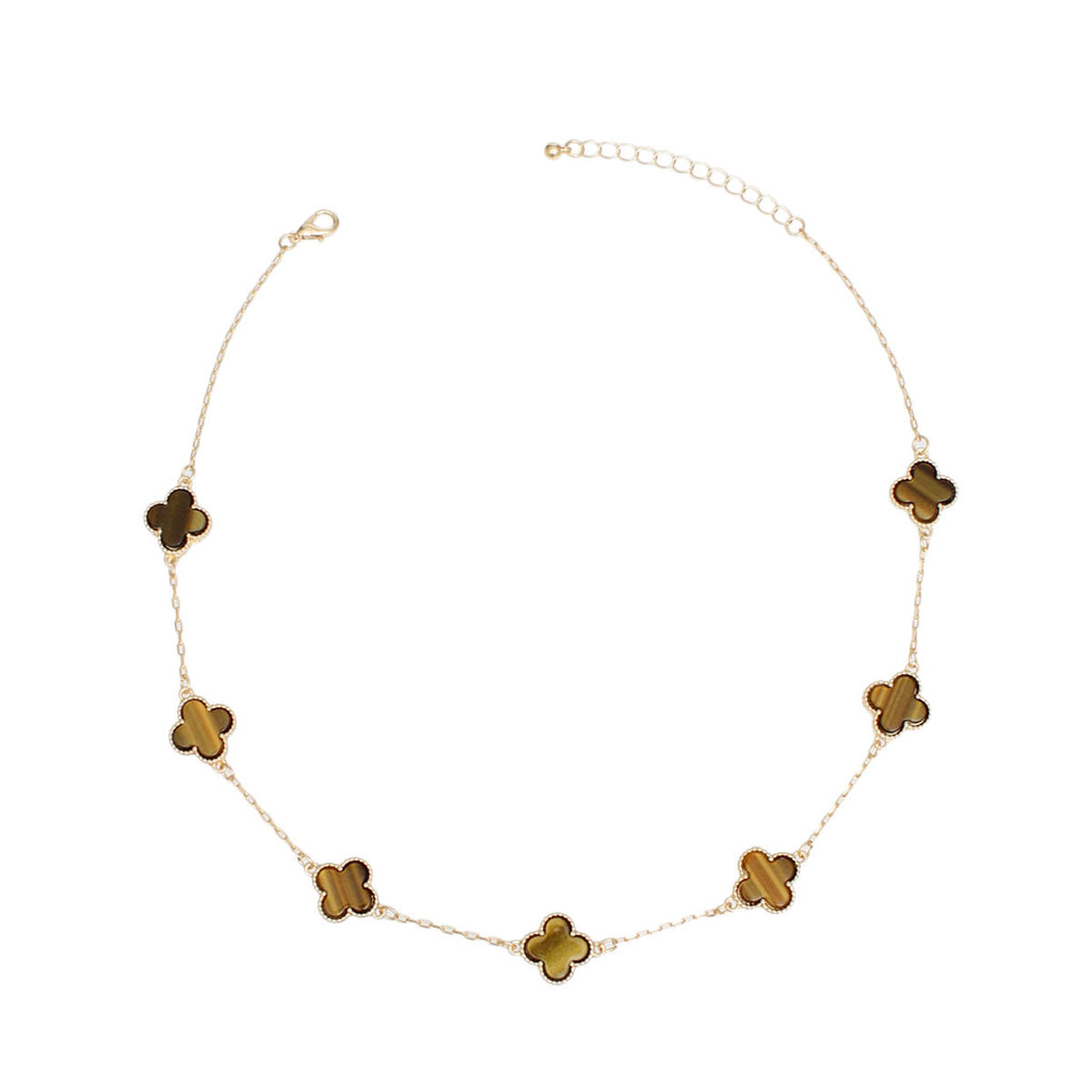 Women's Chain Choker Necklace. Dainty Gold Metal Chain Necklace Featuring Station Marbled Brown Tiger's Eye-Like Resin Acrylic Quatrefoil Clover 7 Motifs. Clovers Measure .65" each. Lobster Clasp Closure.