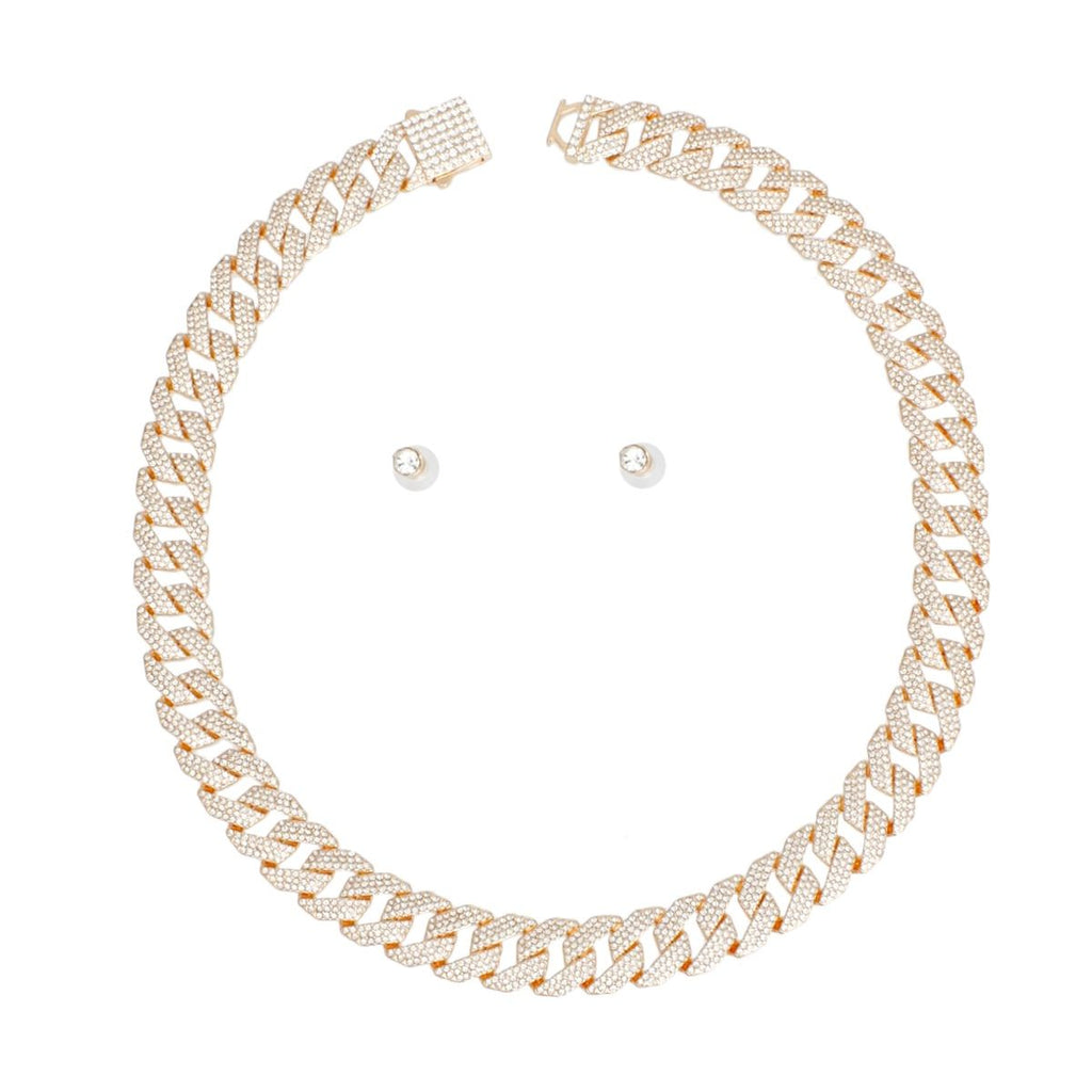 Women's Chain Necklace Set. Iced Gold Metal Diamond Cuban Chain Link Necklace Featuring 3 Row Clear Rhinestone Detailing. Push Lock Closure. Chain Measures 14mm wide. Includes Matching Rhinestone Stud Post Backing Earrings.