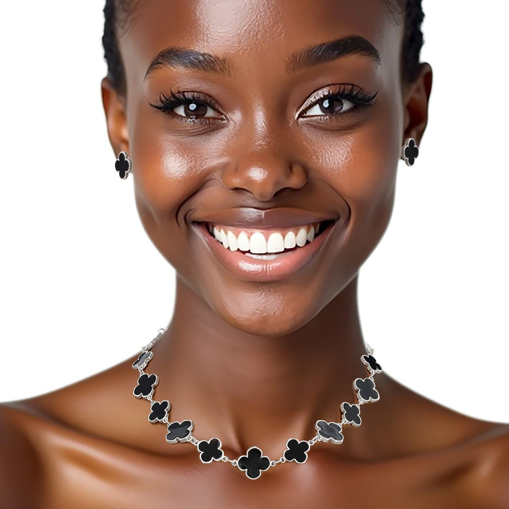 Women's Chain Necklace Set. Luxury Silver Metal with Dual Sided Black Epoxy Large Linked 16 Motifs Quatrefoil Clover Necklace Featuring Alternating Size Quatrefoils. Clovers Measure .75" and .6". Lobster Clasp Closure. Includes Matching Quatrefoil Clover Stud Post Backing Earrings.