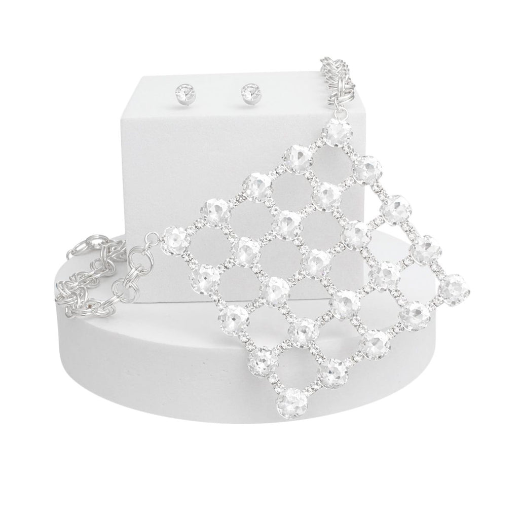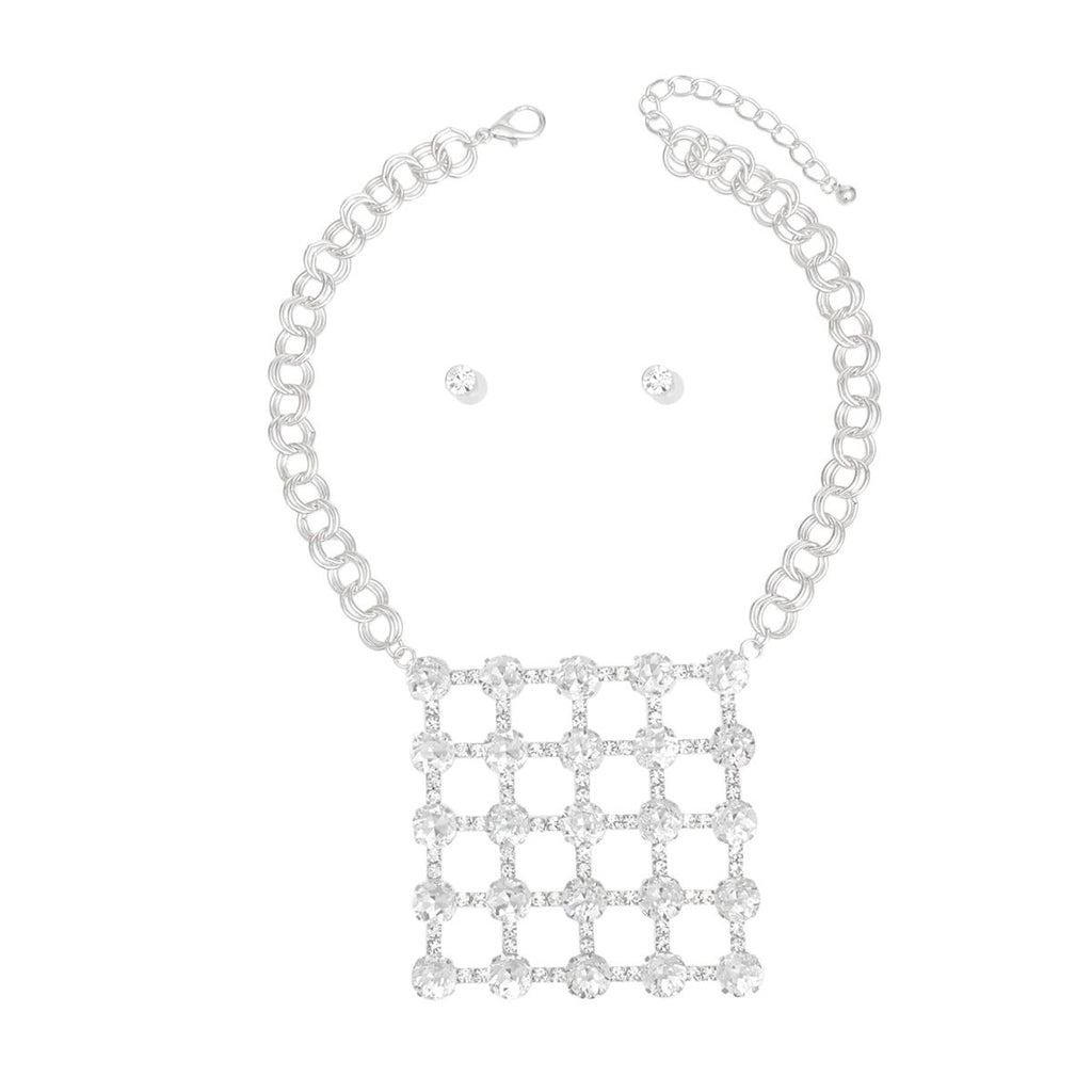 Women's Pendant Necklace Set. Industrial Glam Silver Metal Double Round Link Chain Necklace Featuring XLarge Square Grid Round Clear Crystal and Rhinestone Pendant. Pendant Measures 3.5" x 3.5". Lobster Clasp Closure. Includes Matching Rhinestone Stud Post Backing Earrings.