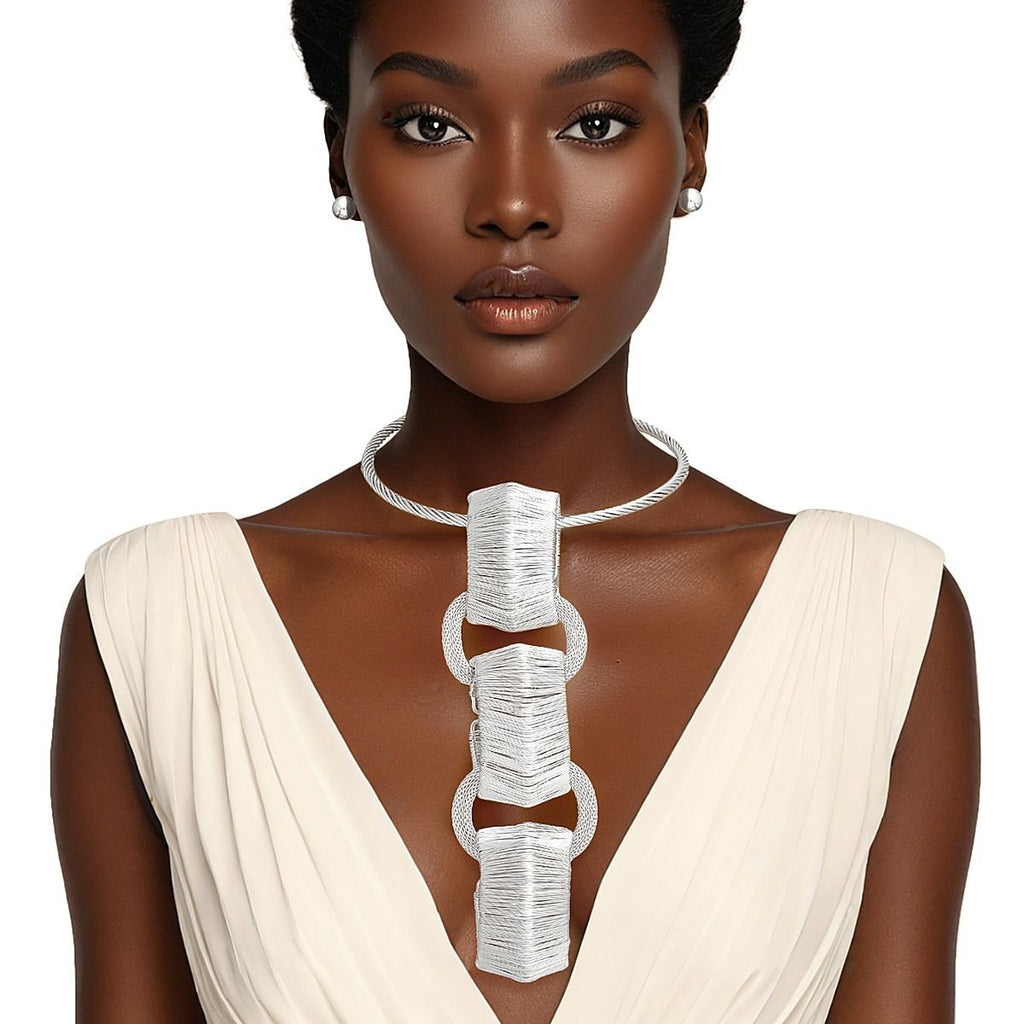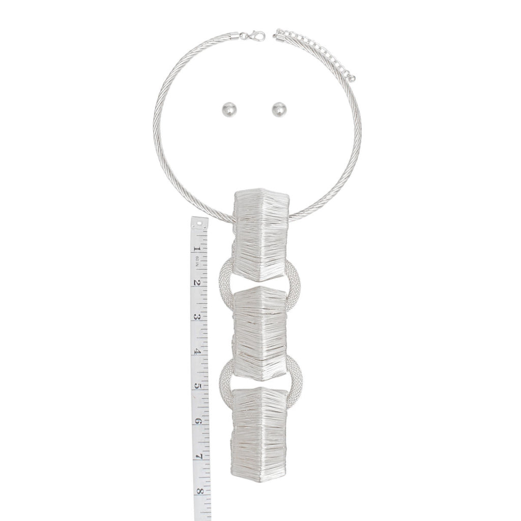 Women's Pendant Necklace Set. XLarge Handmade Silver Twisted Metal Rigid Collar Necklace Featuring Long Linked Pendant with Chunky Wire Wrapped Loops and Mesh Chain Links. Pendant Measures 8" x 1.75". Loops Measure 2" Tall. Lobster Clasp Closure. Includes Matching Ball Stud Post Backing Earrings.