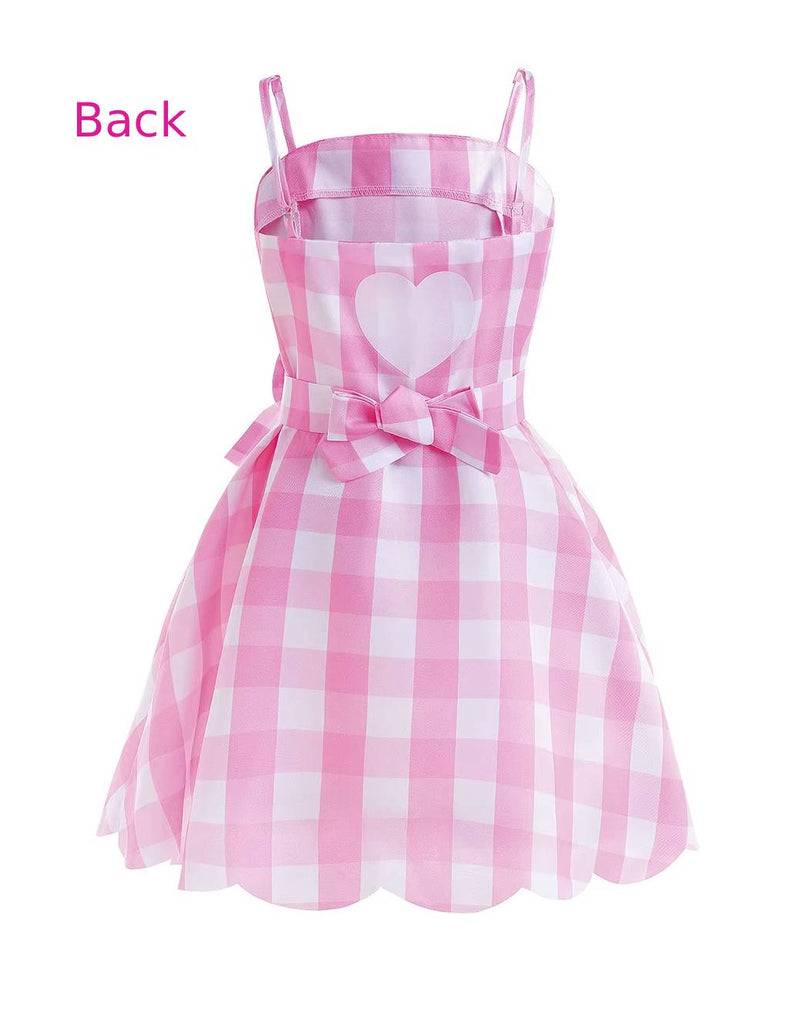 Barbie Girl Pink Plaid Princess Costume for Adult Women - Margot Robbie Movie Dress with Ribbon & 3 Shell Necklace for Halloween & Cosplay
