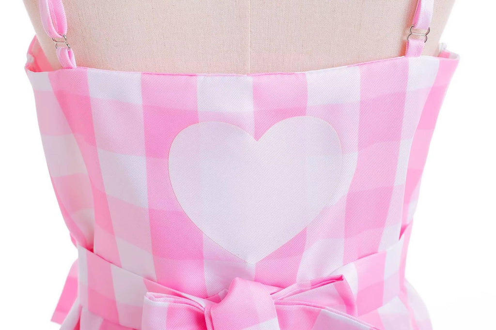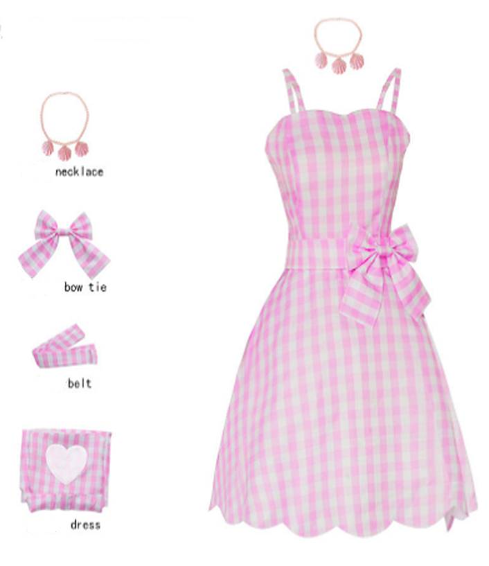 Channel your inner superstar and step into a world of dazzling pink glamour with this officially-inspired Barbie movie dress! Perfect for making a bold statement, this iconic plaid gown comes complete with a delicate ribbon choker and a stunning three-shell necklace to fully embody Margot Robbie's unforgettable princess look.