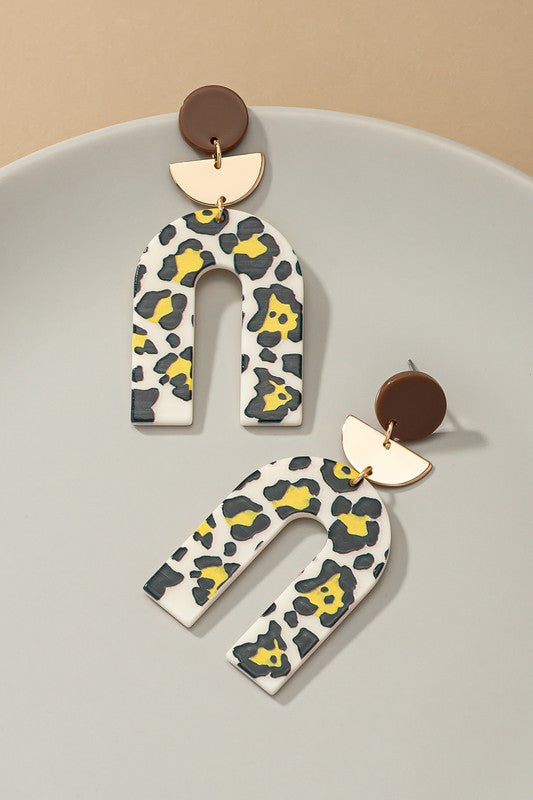 Embossed animal print arch drop earrings. Made of acrylic. Shiny gold plating.