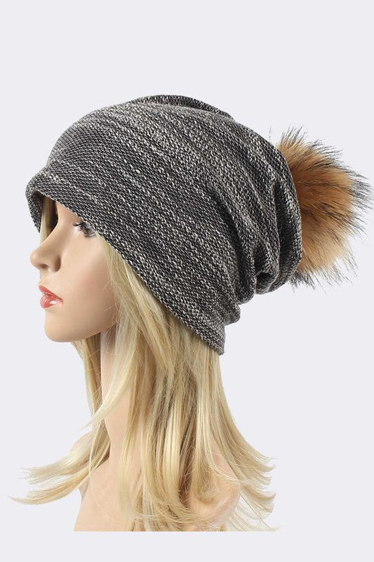 Faux Fur Pom Cotton Blend Slouchy Beanie