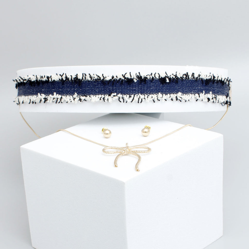 Ripped denim choker with bow metal chain layered. Lobster clasp closure