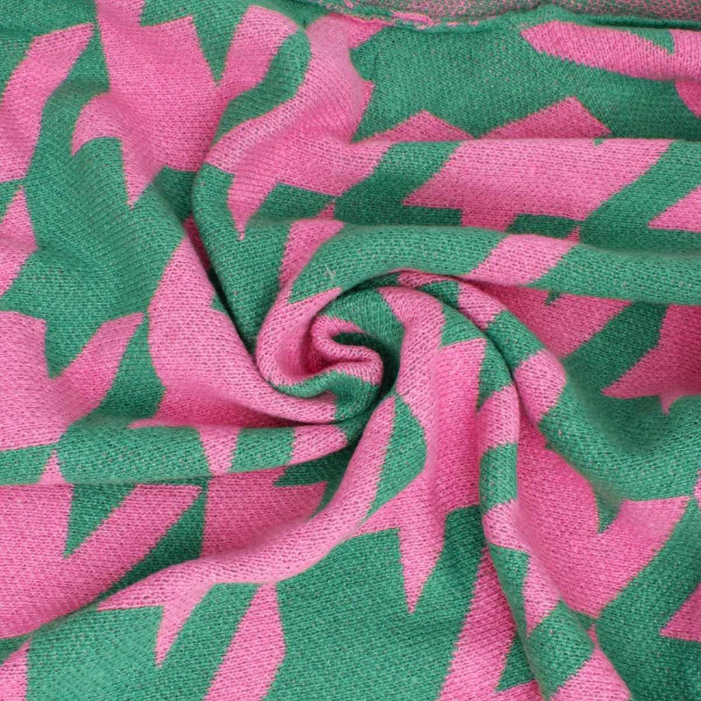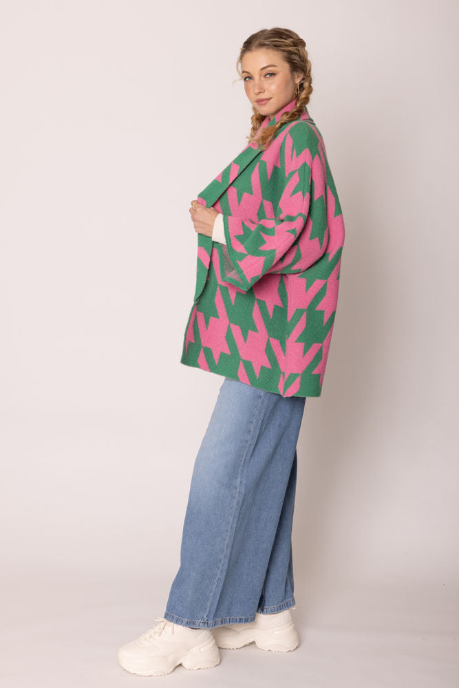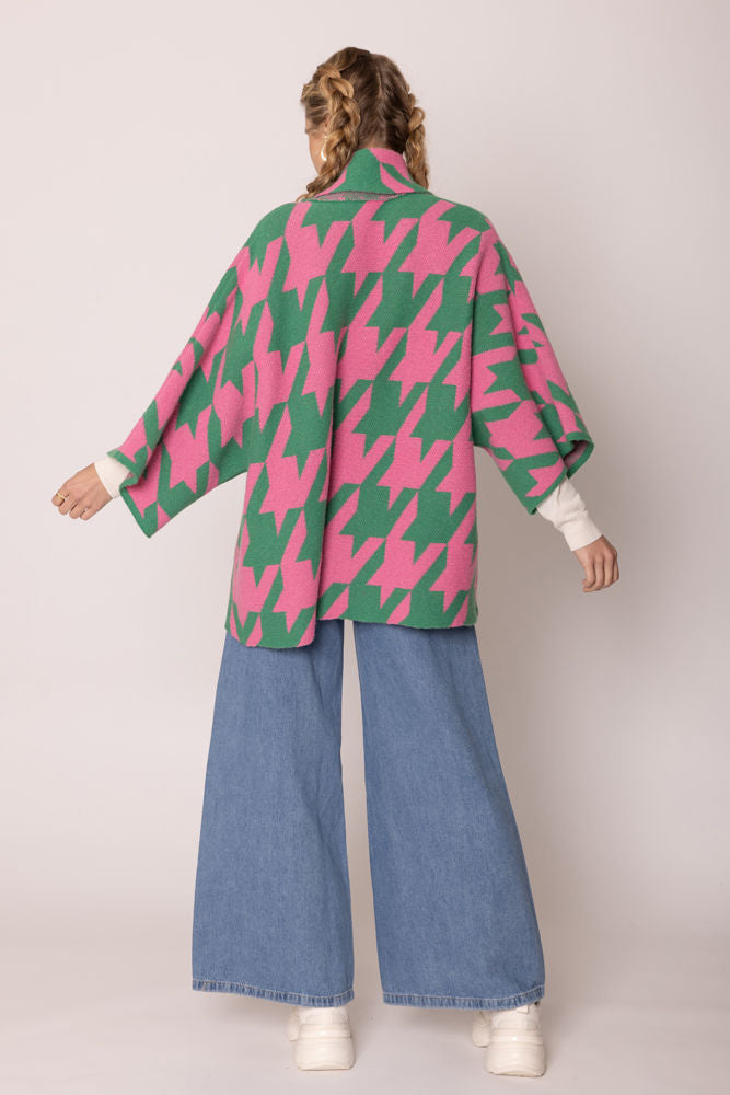 Alpha Kappa Alpha Sorority Paraphernalia Women's Knit Cardigan. Pink and Green Large Print Houndstooth Knit Cardigan Featuring Folded Collar, Wide Sleeves, and Open Front Design. Ultra Soft Knit Sweater Material. 100% Acrylic. Machine Wash Cold. Tumble Dry Low.
