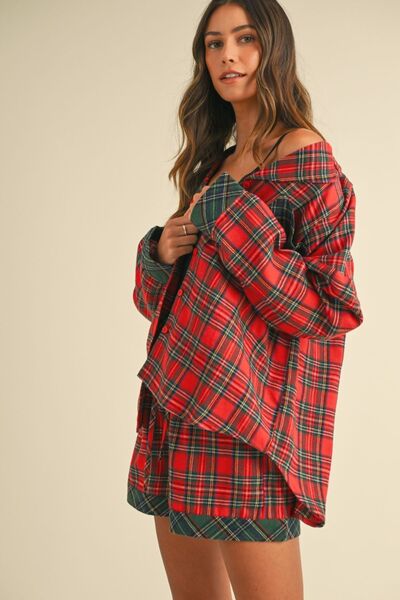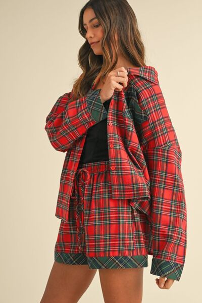 Annie Wear Contrast Plaid Long Sleeve Top and Shorts Set