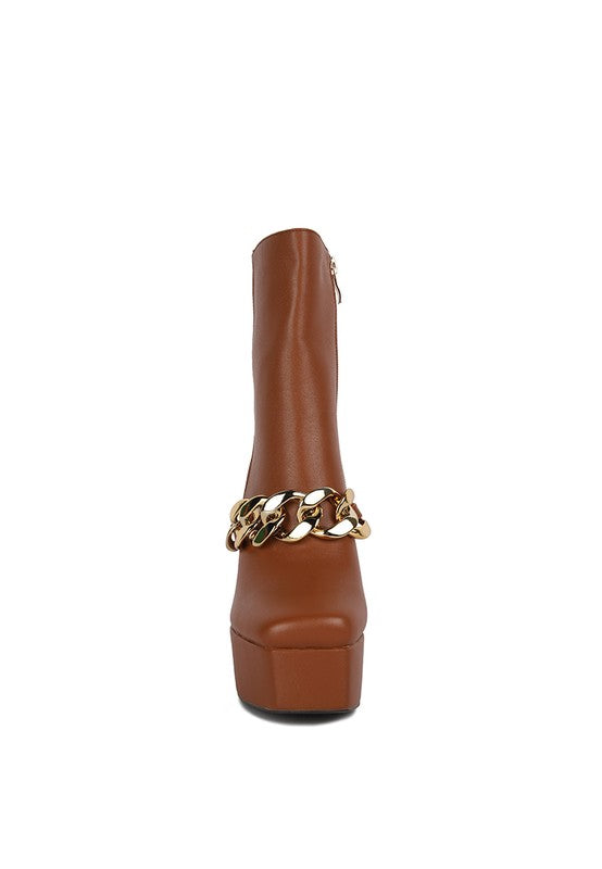 High Block heeled square toe boots with chunky metal chain deets look all gorg! The high platform adds to the height. Has a side zipper for closure.
