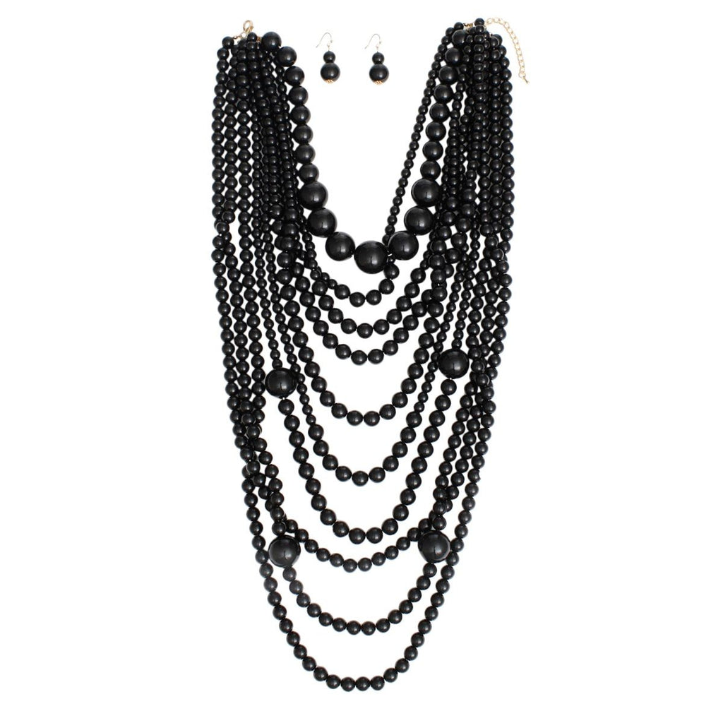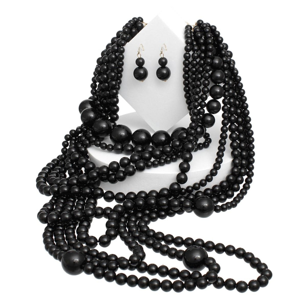Women's Beaded Necklace Set. 10 Strand Black Acrylic Bead Long Layered Necklace Set Featuring Assorted Size Beads and Chunky Large Bead Detailing. Layers Measure 17" to 40". Beads Measure 8mm to 24mm. Gold Metal Lobster Clasp Closure. Includes Matching Fish Hook Double Bead Drop Earrings.