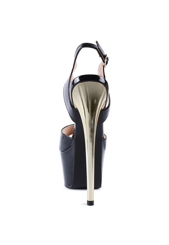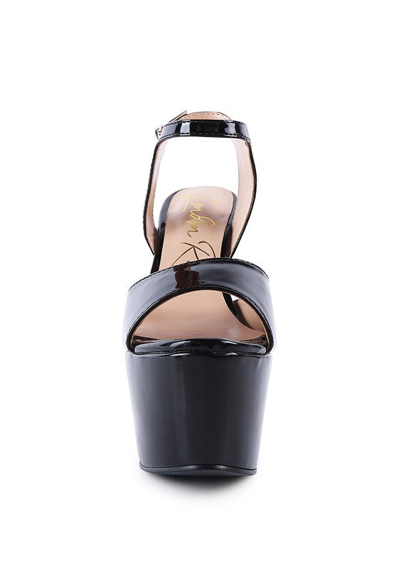 Impactful, bold platform sky high-heels, in patent PU. It has pin buckle ankle fastening detail.