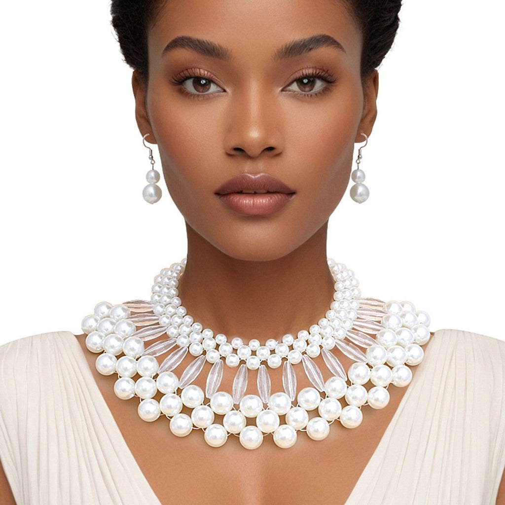 Women's Bib Collar Necklace Set. Vintage Style Acrylic White Pearl Woven Neckline Collar Necklace Featuring Oblong Clear Acrylic Bead and Woven Medium White Pearl Bib Detail. Neckline Woven Pearls Measure 1.85" wide. Full Bib Measures 3" x 10.75". Silver Metal Lobster Clasp Closure. Includes Matching Fish Hook Double Pearl Drop Earrings.
