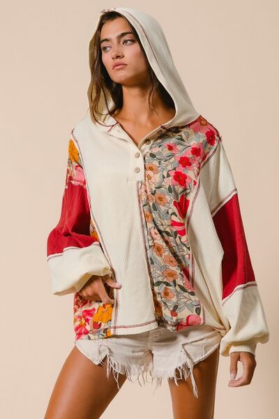 BiBi Contrast Stitching Floral Half Button Hoodie