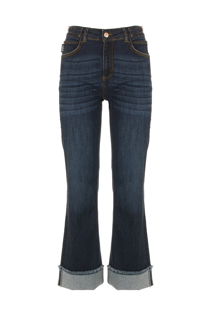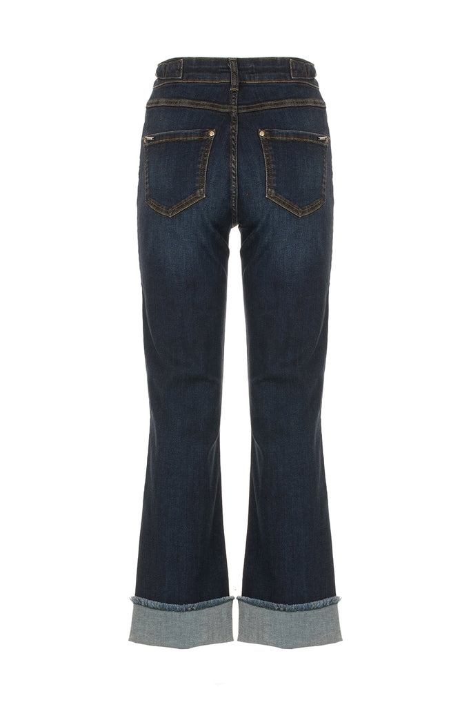 Imperfect denim, blue color, buttons and zip closure, 5-pocket design, slightly elasticized