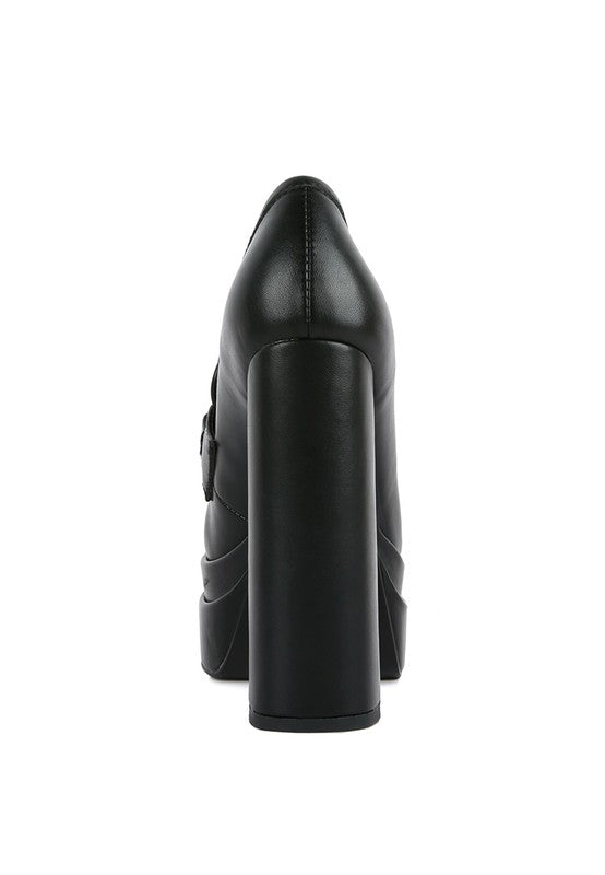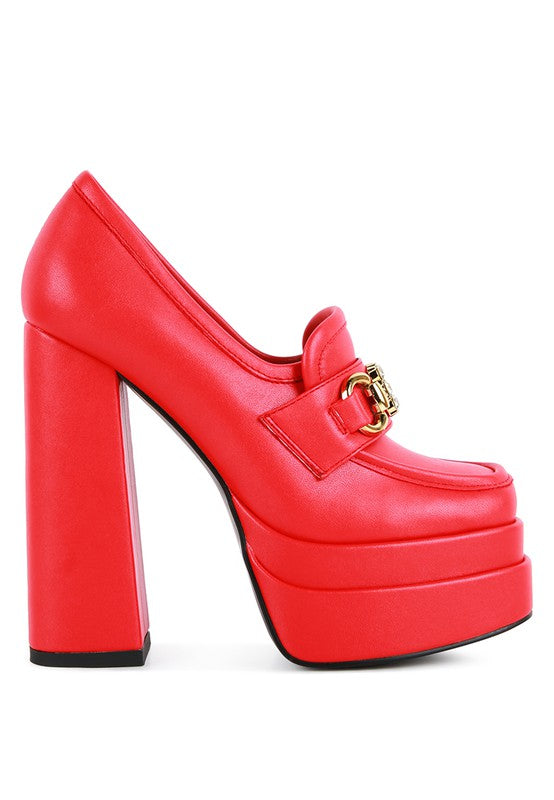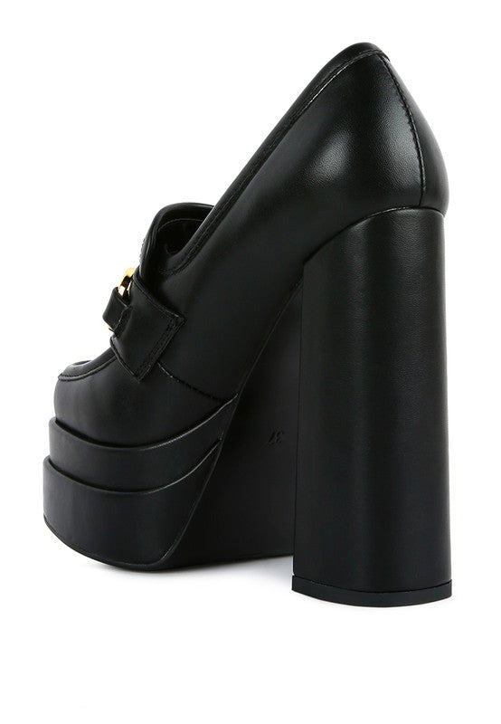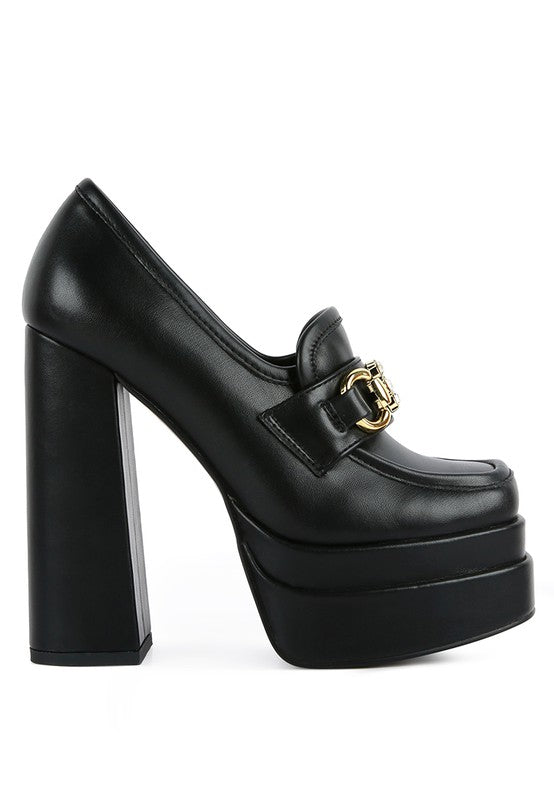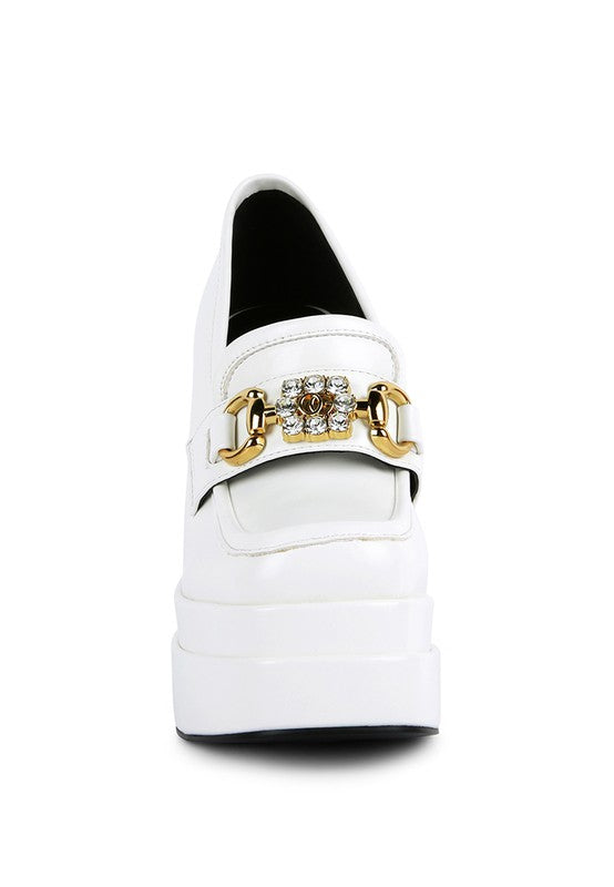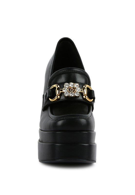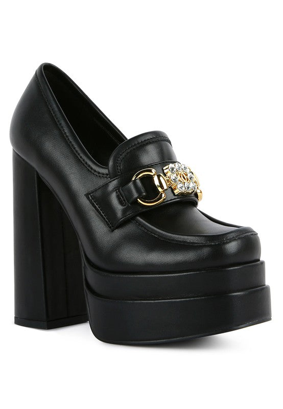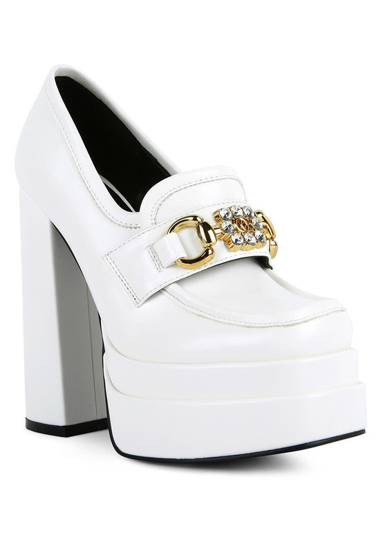 Dress the high street babe way, even at work with these sky-high block-heeled statement women's loafers. Made with high-quality soft PU, these loafers give support with a chunky raised platform and a lightly cushioned insole. The metal chain and stone add to the look.