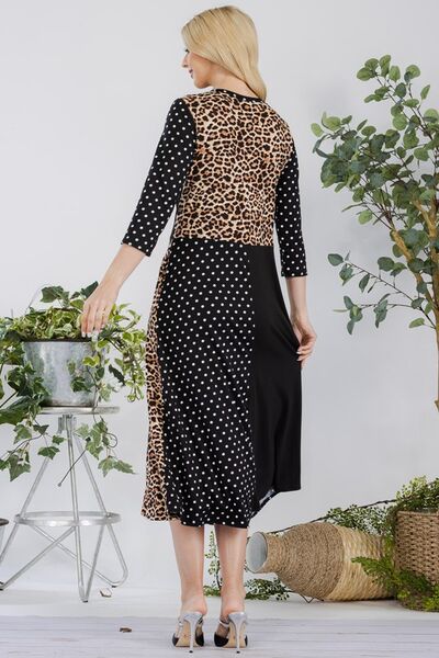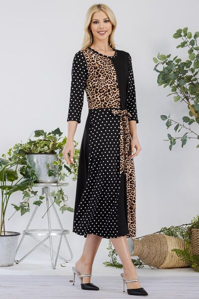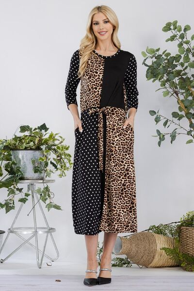 A new mixed pattern midi-dress is here to embrace you with a flowy silhouette, 3/4 sleeves, adjustable tie detail to give you some shape, and hidden side pockets! This midi-dress is perfect for the summer fall transition! Pair it with your favorite accessories, and jacket to make an effortless chic outfit!