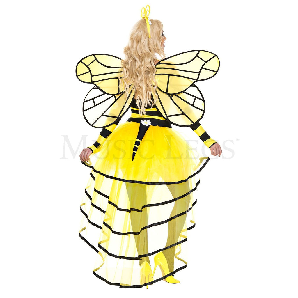 Get buzzed in this Deluxe Queen Bee costume featuring a yellow and black striped halter dress, attached high-low yellow tutu, black ribbon accents, attached daisy flower details, matching daisy antenna headband, matching daisy choker necklace, yellow and black striped arm warmers, matching black thigh high stockings with attached daisy flowers, and bee wings. (Shoes not included.)