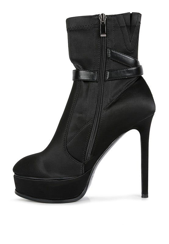 High heeled plush satin stiletto heeled ankle bootie. Made with fine craftsmanship, this pair of pointed toe structure luxe winter boot comes with side zipper opening and ankle band harness details. The elasticated dart gussets make it more flexible and add to the fit.
