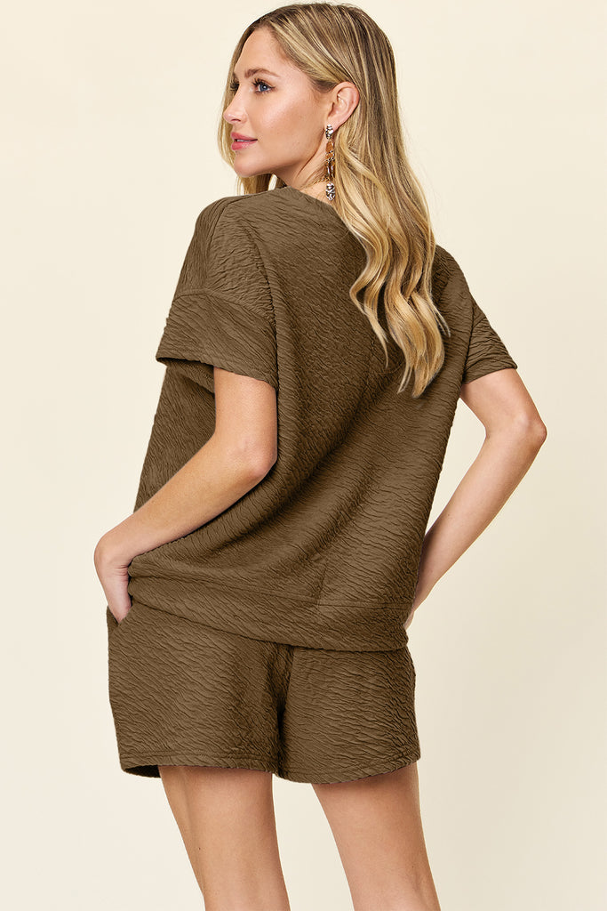 Double Take Full Size Texture Short Sleeve T-Shirt and Drawstring Shorts Set