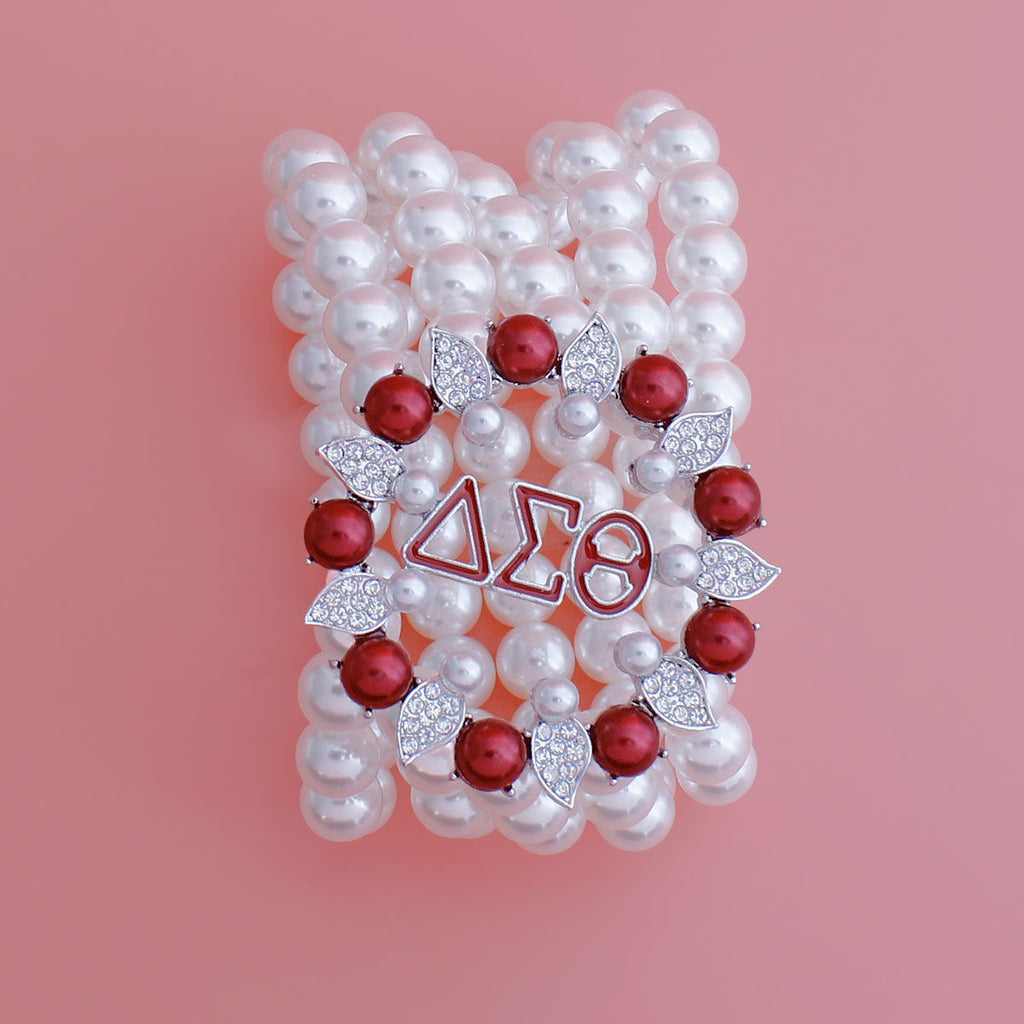 Women's Stretch Bracelet Featuring 5 Strands of White Acrylic Pearls with Elegant Round Silver Metal Rhinestone Leaves and Delta Sigma Theta, DST,DST Paraphernalia Red Detail. Stretch to Fit. Round Detail measures 2.25".