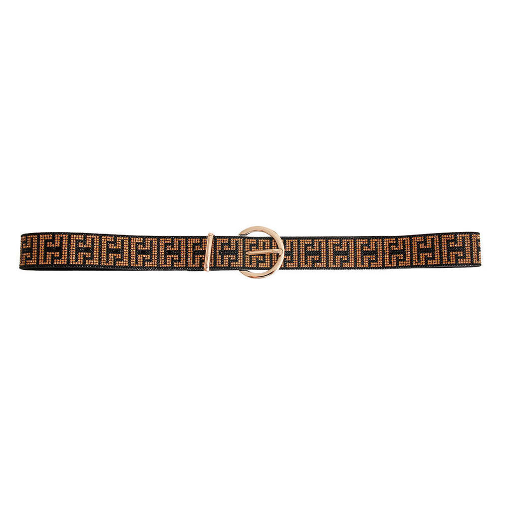 Black Designer Inspired Belt Featuring 14 Row Black and Gold Greek Key Rhinestone Detailing and Gold Metal Hardware. Belt measures 1.25 inches wide