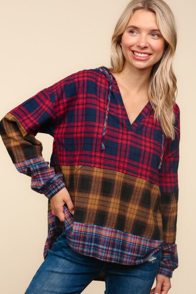 This long sleeve top features a stylish vibrant color block plaid pattern. The unique cut-edge detail and attached hood add a relaxed vibe, making it perfect for casual outings. Pair it with jeans or joggers for a chic yet comfortable look.