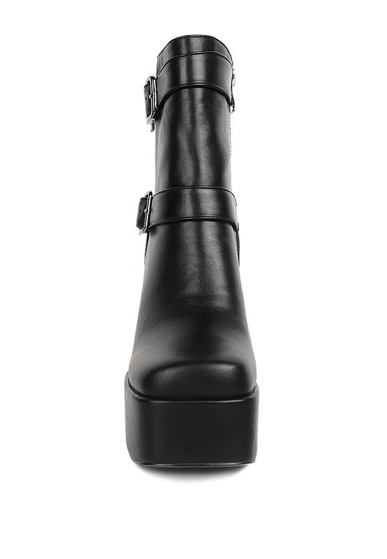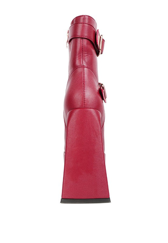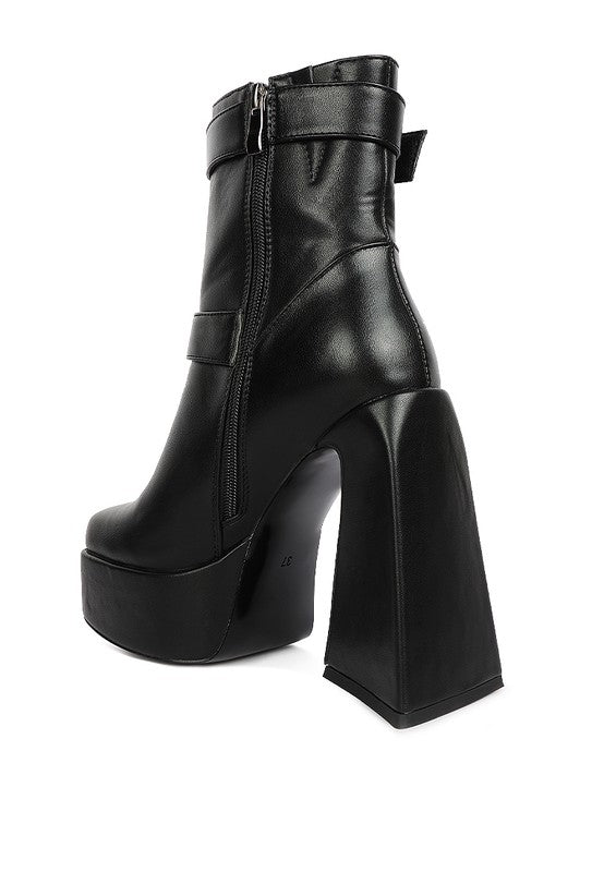 High Platform Ankle boot in trendy square cut toe, twin pin buckle detailed strap around the ankle looks alluring. It has cut out high block heels constructed on chunky high platform" A perfect visit to 80's inspired by current trend.