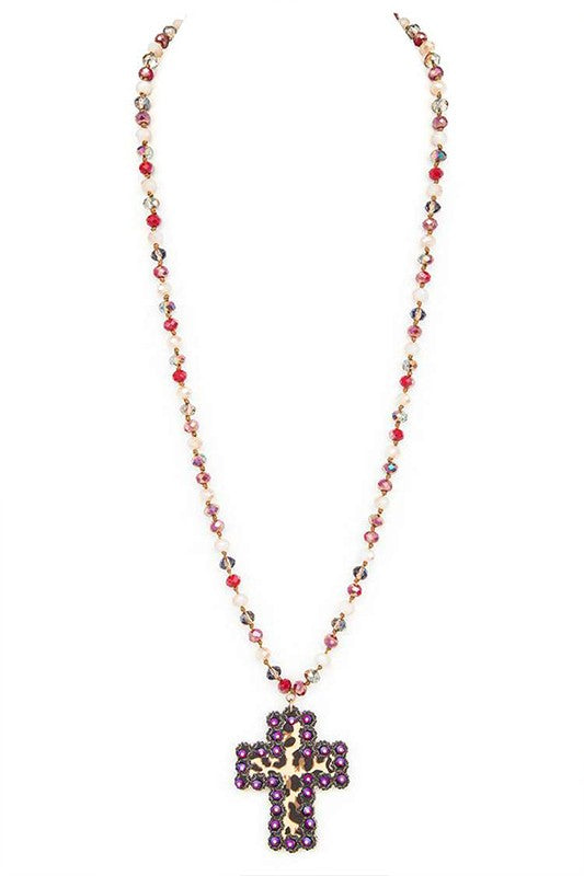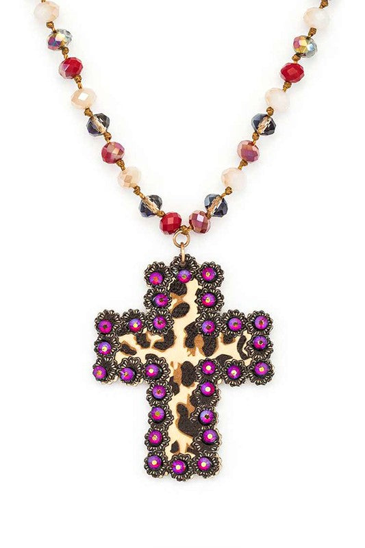 Leopard Printed Cross Pendant Beaded Long Necklace