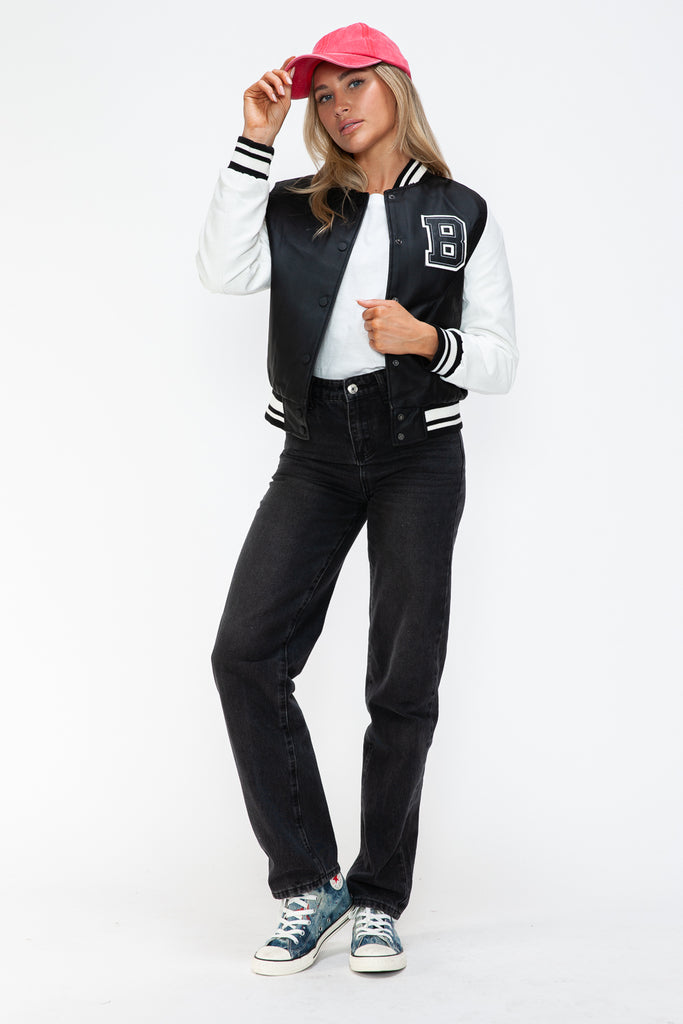Love Me Now PU Leather Contrast Snap Down Bomber Jacket